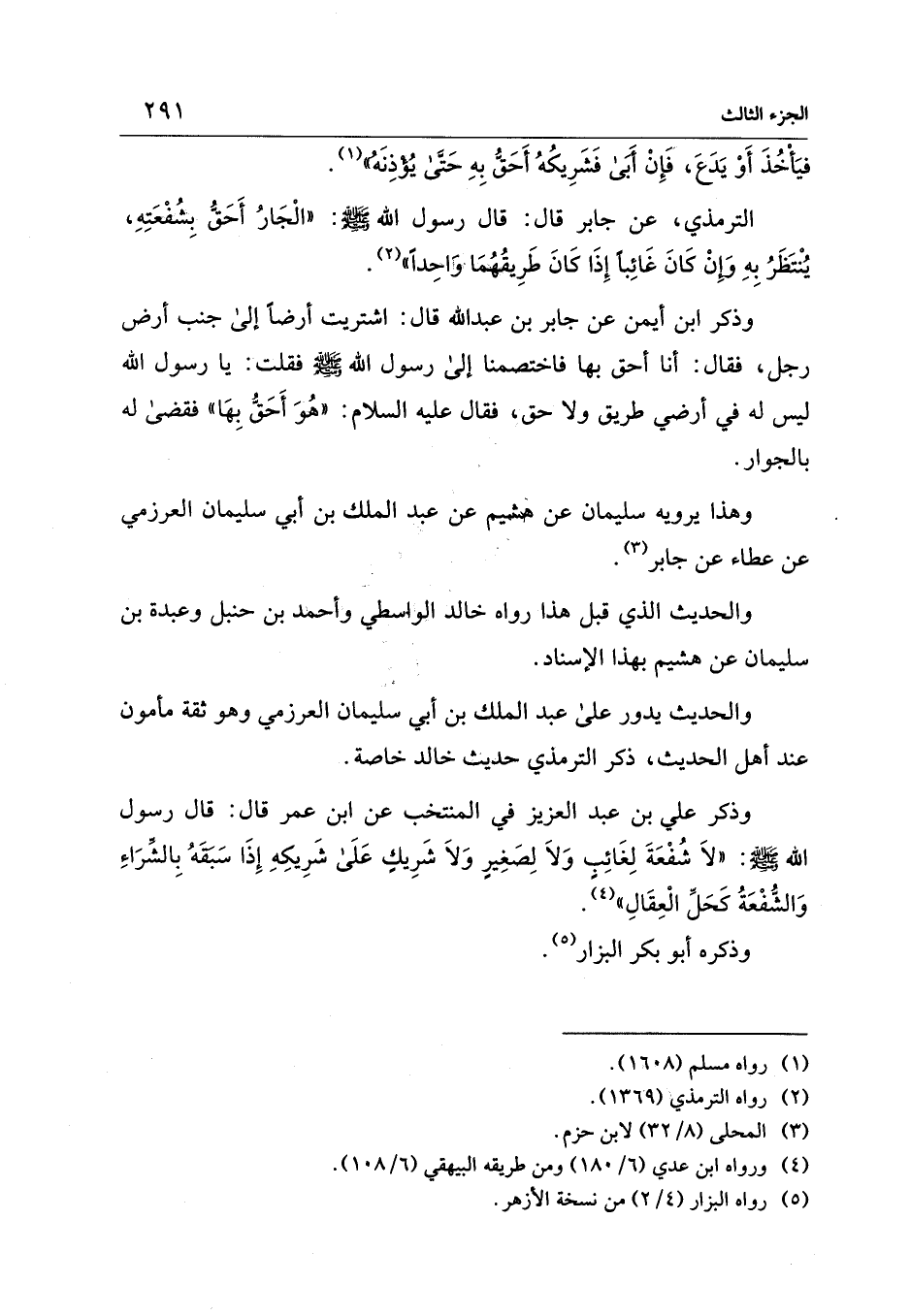 الترمذي، عن جابر قال: قال رسول الله - صلى الله عليه وسلم -: "الْجَارُ أَحَقُّ بِشُفْعَتِهِ، يُنْتَظَرُ بِهِ وَإِنْ كَانَ غَائِبًا إِذَا كَانَ طَرِيقُهُمَا وَاحِدًا" (¬2).