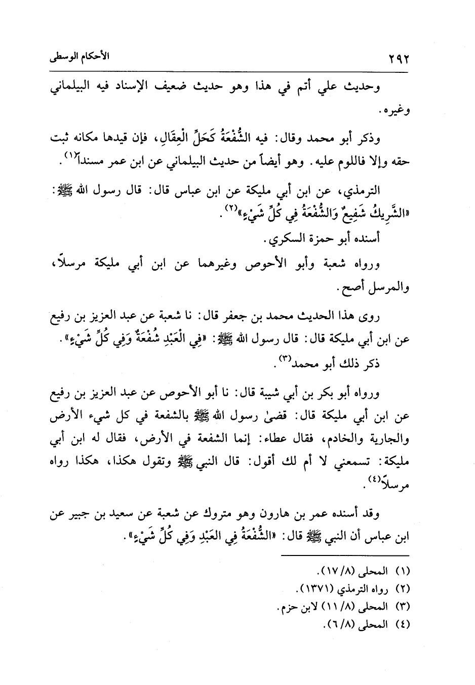 روى هذا الحديث محمَّد بن جعفر قال: نا شعبة عن عبد العزيز بن رفيع عن ابن أبي مليكة قال: قال رسول الله - صلى الله عليه وسلم -: "فِي الْعَبْدِ شُفْعَةٌ وَفِي كُلِّ شَيْءٍ". ذكر ذلك أبو محمَّد (¬3).