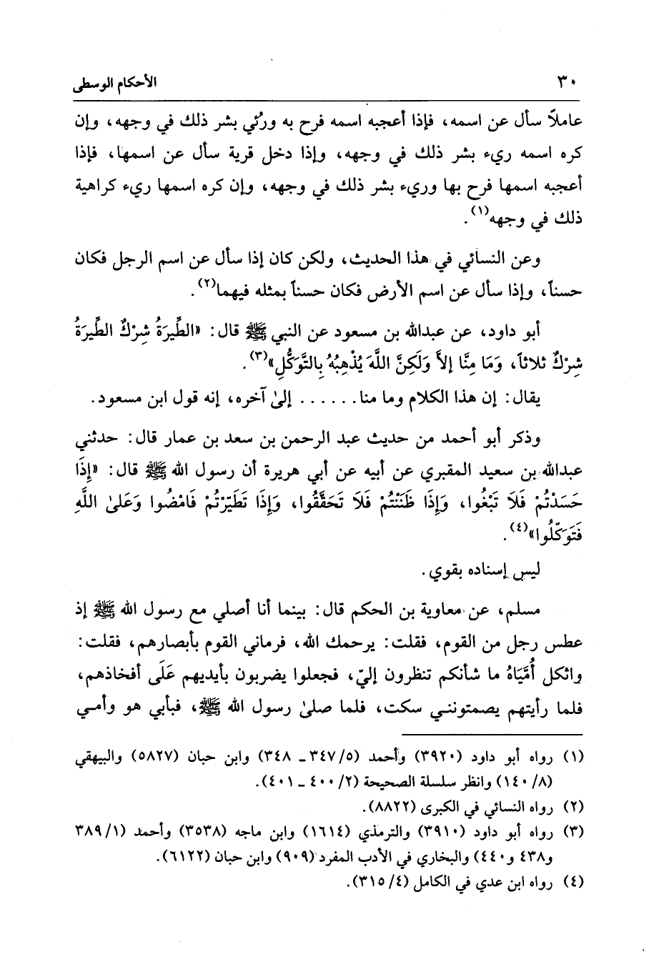 أبو داود، عن عبد الله بن مسعود عن النبي - صلى الله عليه وسلم - قال: "الطِّيرَةُ شِرْكٌ الطِّيرَةُ شِرْكٌ ثلاثًا، وَمَا مِنَّا إلَّا وَلَكِنَّ اللهَ يُذْهِبُهُ بِالتَّوَكُّلِ" (¬3).