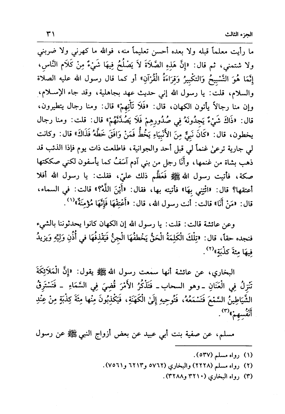 البخاري، عن عائشة أنها سمعت رسول الله - صلى الله عليه وسلم - يقول: "إِنَّ الْمَلاَئِكَةَ تَنْزِلُ في الْعَنَانِ -وهو السحاب- فَتَذْكُرُ الأَمْرَ قُضِيَ في السَّمَاءِ- فَتَسْتَرِقُ الشَّيَاطِينُ السَّمْعَ فَتَسْمَعُهُ، فَتُوحِيهِ إِلَى الْكَهَنَةِ، فَيَكْذِبُونَ مِنْها مِئَةَ كِذْبَةٍ مِنْ عِنْدِ أَنْفُسِهِمْ" (¬3).