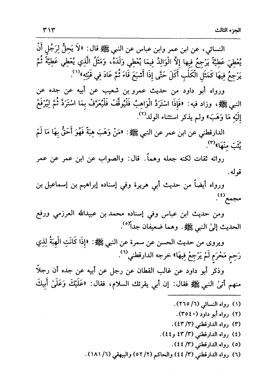 النسائي، عن ابن عمر وابن عباس عن النبي - صلى الله عليه وسلم - قال: "لاَ يَحِلُّ لِرَجُلٍ أَنْ يُعْطِيَ عَطِيَّة يَرْجِعُ فِيِها إِلَّا الْوَالِدُ فِيمَا يُعْطِي وَلَدَهُ، وَمَثَلُ الَّذِي يُعْطِي عَطِيَّة ثُمَّ يَرْجِعُ فِيها كَمَثَلِ الْكَلْبِ أَكَلَ حَتَّى إِذَا أَشبَعَ قَاءَ ثُمَّ عَادَ فِي قَيْئِهِ" (¬1).