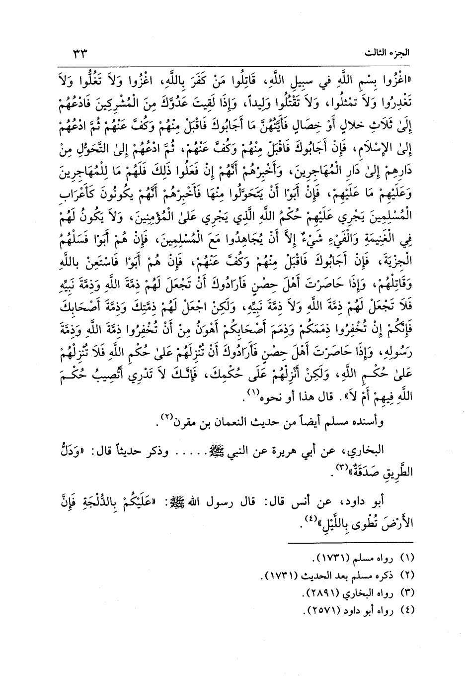 إِلَى ثَلاَثِ خلالٍ أَوْ خِصَالٍ فَأيَّتُهُنَّ مَا اجَابُوكَ فَاقْبَلْ مِنْهُمْ وَكُفَّ عَنْهُمْ ثُمَّ ادْعُهُمْ إِلى الإِسْلاَمِ، فَإِنْ أَجَابُوكَ فَاقْبَلْ مِنْهُمْ وَكفَّ عَنْهُمْ، ثُمَ ادْعُهُمْ إِلى التَحوُّلِ مِنْ دَارِهِمْ إِلى دَارِ الْمُهَاجِرِينَ، وَأَخْبِرْهُمْ أَنَّهُمْ إِنْ فَعَلُوا ذَلِكَ فَلَهُمْ مَا لِلْمُهَاجِرِينَ وَعَلَيْهِمْ مَا عَلَيْهِمْ، فَإِنْ أبوْا أَنْ يتحَوَّلُوا مِنْهَا فَأخْبِرْهُمْ أنَّهُمْ يكُونُونَ كَأعرَابِ الْمُسْلِمِينَ يَجْرِي عَلَيْهِمْ حُكْمُ اللهِ الذِي يَجْرِي عَلى الْمُومِنِينَ، وَلاَ يَكُونُ لَهُمْ في الْغَنِيمَةِ وَالْفَيْءِ شَيْءٌ إلَّا أَنْ يُجَاهِدُوا مَعَ الْمُسْلِمِينَ، فَإِنْ هُمْ أَبَوْا فَسَلْهُمُ الْجِزْيَةَ، فَإِنْ أَجَابُوكَ فَاقْبَلْ مِنْهُمْ وَكُفَّ عَنْهُمْ، فَإِنْ هُمْ أَبَوْا فَاسْتَعِنْ باللهِ وَقَاتِلْهُمْ، وَإِذَا حَاصَرْتَ أَهْلَ حِصْنٍ فَأَرادُوكَ أَنْ تَجْعَلَ لَهُمْ ذِمَّةَ اللهِ وَذِمَّةَ نَبِيِّهِ فَلاَ تَجْعَلْ لَهُمْ ذِمَّةَ اللهِ وَلاَ ذِمَّةَ نَبِيِّهِ، وَلَكِنْ اجْعَلْ لَهُمْ ذِمَّتِكَ وَذِمَّةَ أَصْحَابِكَ فَإِنَّكُمْ إِنْ تُخْفِرُوا ذِمَمَكُمْ وَذِمَمَ أَصْحَابِكُمْ أَهْوَنُ مِنْ أَنْ تُخْفِرُوا ذِمةَ اللهِ وَذِمَّةَ رَسُولهِ، وَإِذَا حَاصَرْتَ أهْلَ حِصْنٍ فَأَرادُوكَ أَنْ تنزِلَهُمْ عَلى حُكْمِ اللهِ فَلاَ تُنْزِلْهُمْ عَلى حُكْمِ اللهِ، وَلَكِنْ أَنْزِلْهُمْ عَلَى حُكْمِكَ، فَإِنَّكَ لاَ تَدْرِي أَتُصِيبُ حُكْمَ اللهِ فِيهِمْ أَمْ لاَ". قال هذا أو نحوه (¬1).