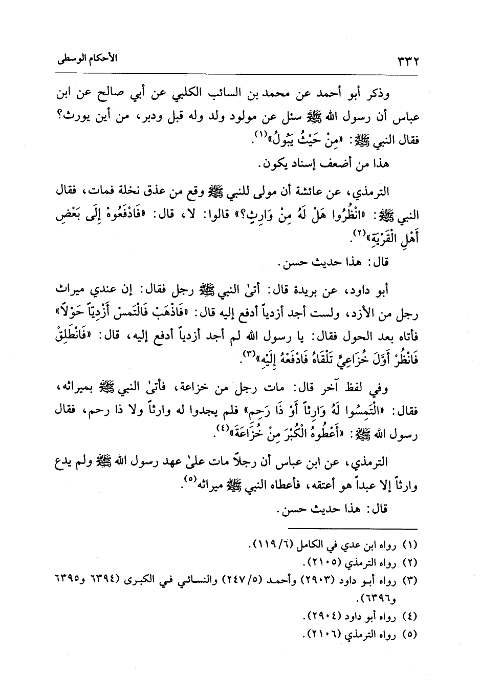 الترمذي، عن ابن عباس أن رجلًا مات على عهد رسول الله - صلى الله عليه وسلم - ولم يدع وارثًا إلا عبدًا هو أعتقه، فأعطاه النبي - صلى الله عليه وسلم - ميراثه (¬5).
