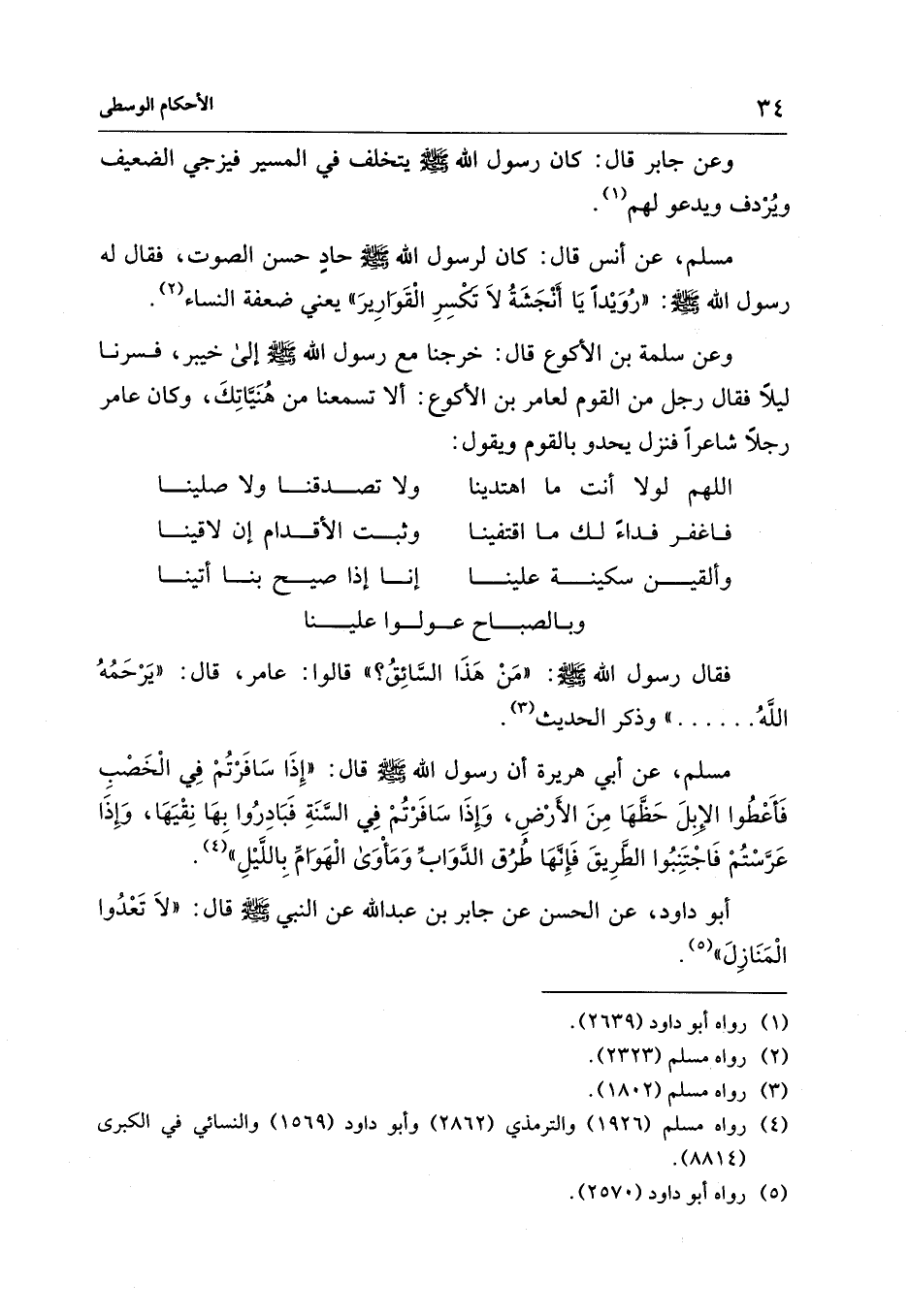 مسلم، عن أبي هريرة أن رسول الله - صلى الله عليه وسلم - قال: "إِذَا سَافَرْتُمْ فِي الْخَصْبِ فَأَعْطُوا الإِبلَ حَظَّهَا مِنَ الأَرْضِ، وَإِذَا سَافَرْتُمْ في السَّنَةِ فَبَادِرُوا بها نِقْيَهَا، وَإِذَا عَرَّسْتُمْ فَاجْتَنِبُوا الطَّرِيقَ فَإِنَّهَا طُرُق الدَّوَابِّ وَمَأوَى الْهَوَامِّ بِاللَّيْلِ" (¬4).