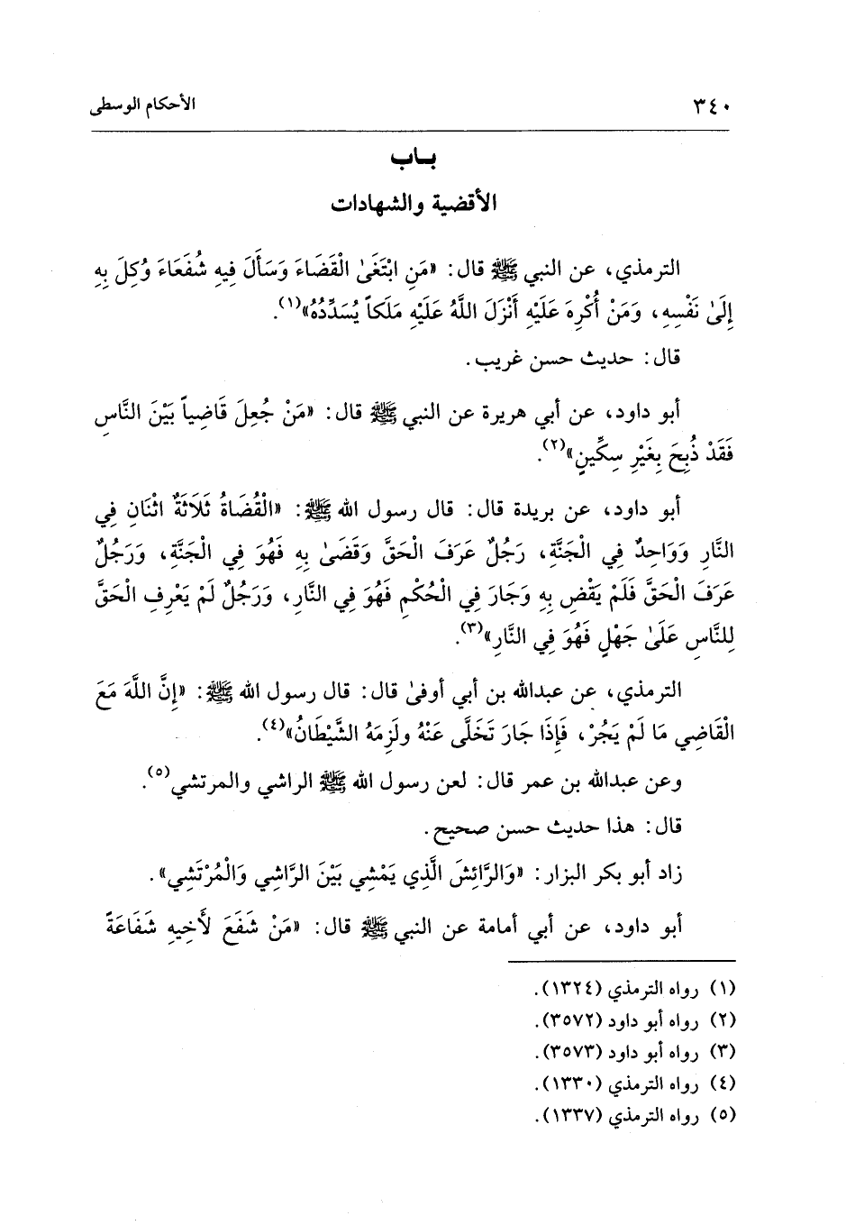 أبو داود، عن بريدة قال: قال رسول الله - صلى الله عليه وسلم -: "الْقُضَاةُ ثَلاَثَةٌ اثْنَانِ فِي النَّارِ وَوَاحِدٌ فِي الْجَنَّةِ، رَجُلٌ عَرَفَ الْحَق وَقَضَى بِهِ فَهُوَ فِي الْجَنَّةِ، وَرَجُلٌ عَرَفَ الْحَقَّ فَلَم يَقْضِ بِهِ وَجَارَ فِي الْحُكْمِ فَهُوَ فِي النَّارِ، وَرَجُلٌ لَمْ يَعرِفِ الْحَقَّ لِلنَّاسِ عَلَى جَهْلٍ فَهُوَ فِي النَّارِ" (¬3).