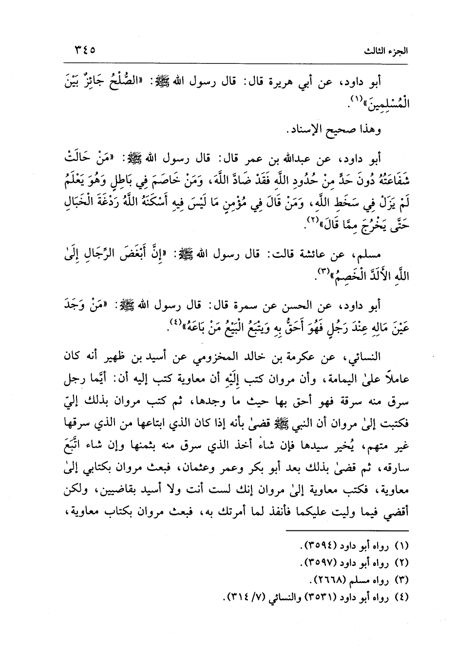 أبو داود، عن أبي هريرة قال: قال رسول الله - صلى الله عليه وسلم -: "الصُّلْحُ جَائِزٌ بَيْنَ الْمُسْلِمِينَ" (¬1).