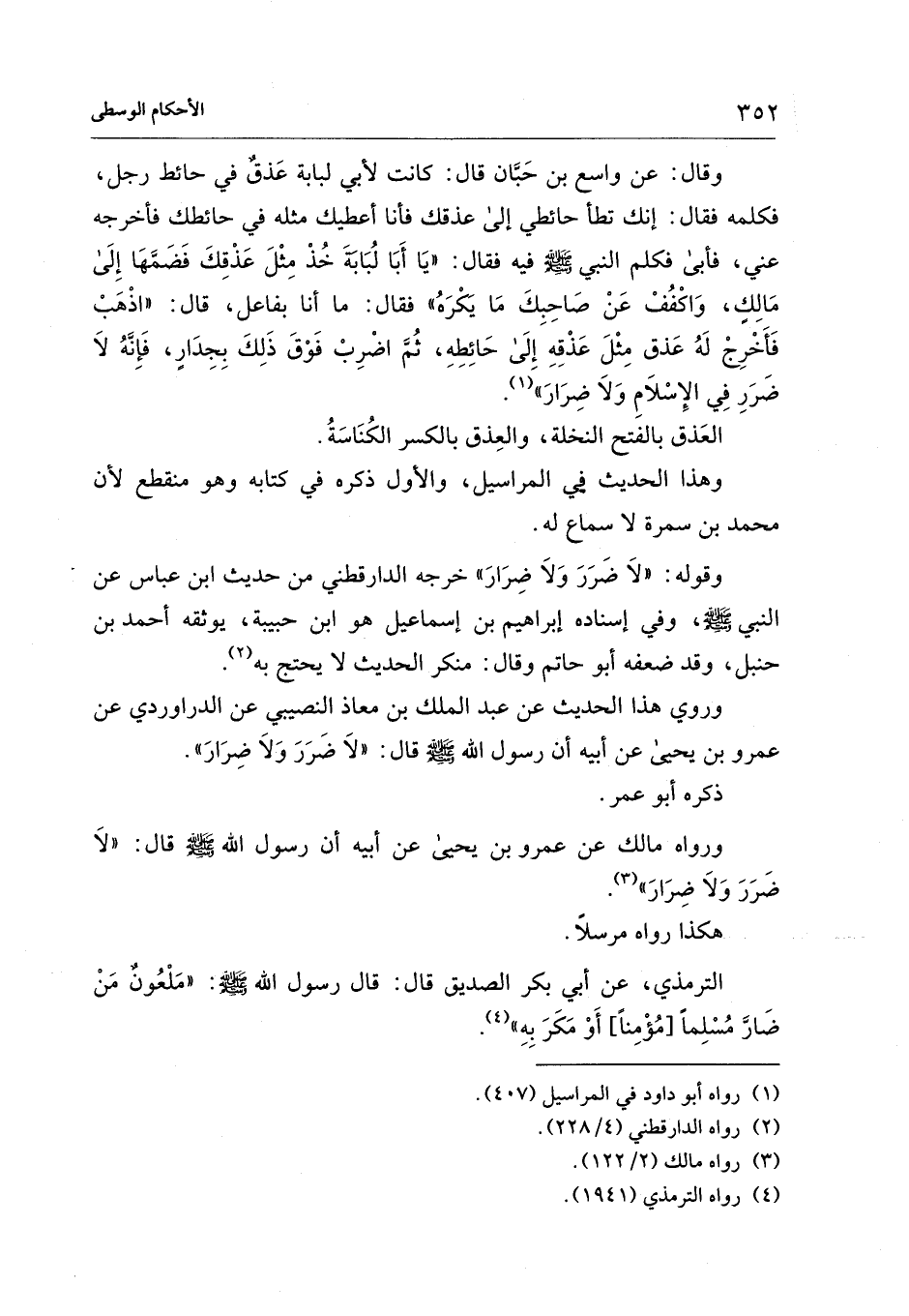 وقال: عن واسع بن حَبَّان قال: كانت لأبي لبابة عَذقٌ في حائط رجل، فكلمه فقال: إنك تطأ حائطي إلى عذقك فأنا أعطيك مثله في حائطك فأخرجه عني، فأبى فكلم النبي - صلى الله عليه وسلم - فيه فقال: "يَا أَبَا لُبَابَةَ خُذْ مِثْلَ عَذْقِكَ فَضَمها إِلَى مَالِك، وَاكْفُفْ عَنْ صَاحِبِكَ مَا يَكْرَهُ" فقال: ما أنا بفاعل، قال: "اذْهبْ فَأَخْرِجْ لَهُ عَذق مِثْلَ عَذْقِهِ إِلَى حَائِطِهِ، ثُمَّ اضْرِبْ فَوْقَ ذَلِكَ بِجِدَارٍ، فَإِنَّهُ لاَ ضَرَرِ فِي الِإسْلاَمِ وَلاَ ضِرَارَ" (¬1).