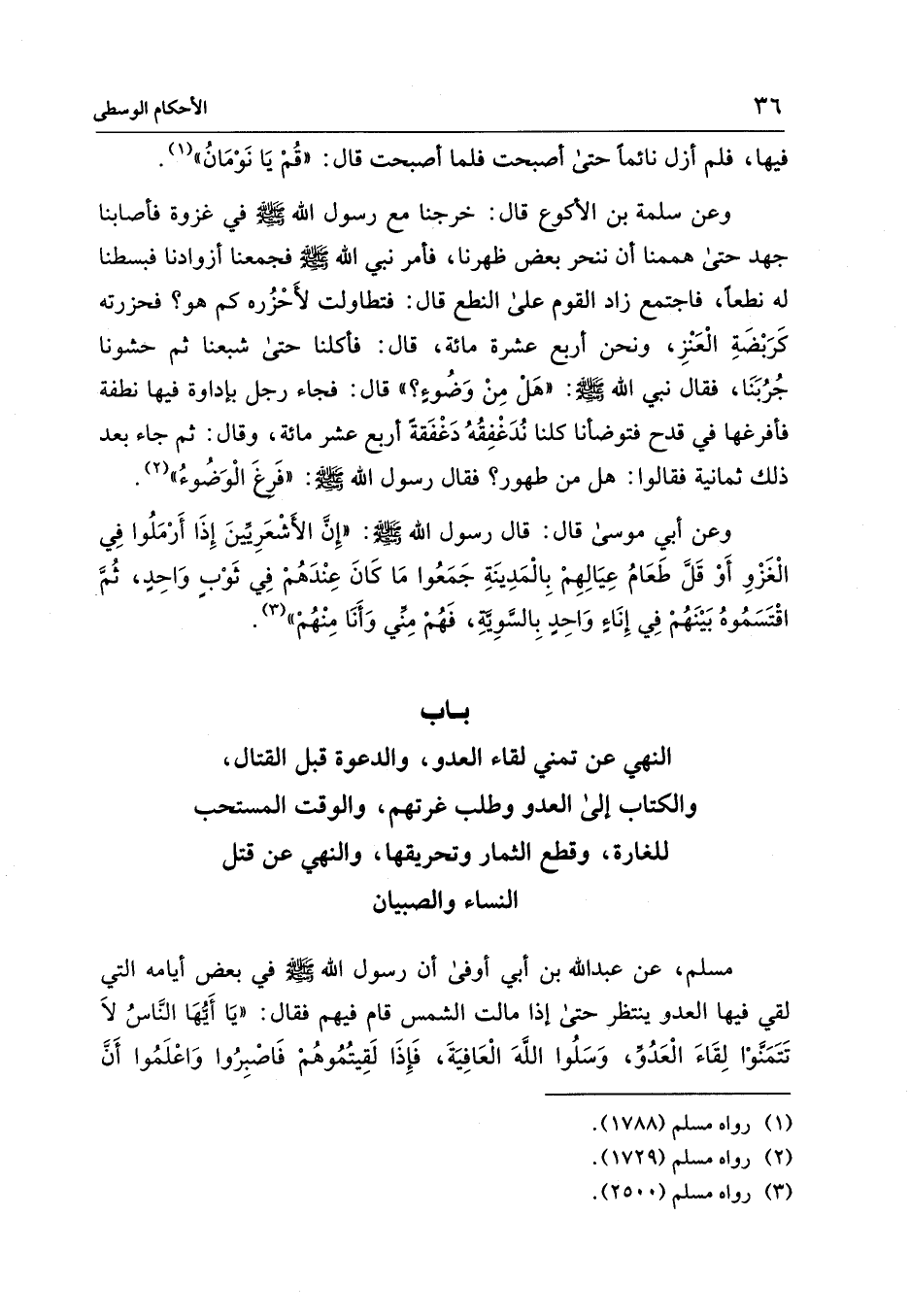 مسلم، عن عبد الله بن أبي أوفى أن رسول الله - صلى الله عليه وسلم - في بعض أيامه التي لقي فيها العدو ينتظر حتى إذا مالت الشمس قام فيهم فقال: "يَا أَيُّهَا النَّاسُ لاَ تَتَمَنَّوْا لِقَاءَ الْعَدُوِّ، وَسَلُوا اللهَ الْعَافِيَةَ، فَإِذَا لَقِيتُمُوهُمْ فَاصْبِرُوا وَاعْلَمُوا أَنَّ