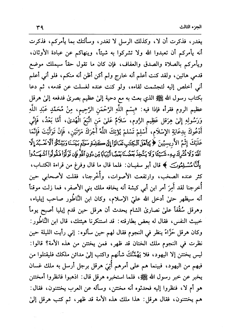 يغدر، فذكرت أن لا، وكذلك الرسل لا تغدر، وسألتك بما يأمركم، فذكرت أنه يأمركم أن تعبدوا الله ولا تشركوا به شيئًا، وينهاكم عن عبادة الأوثان، ويأمركم بالصلاة والصدق والعفاف، فإن كان ما تقول حقًا سيملك موضع قدمي هاتين، ولقد كنت أعلم أنه خارج ولم أكن أظن أنه منكم، فلو أني أعلم أني أخلص إليه لتجشمت لقاءه، ولو كنت عنده لغسلت عن قدمه، ثم دعا بكتاب رسول الله - صلى الله عليه وسلم - الذي بعث به مع دحية إلى عظيم بصرى فدفعه إلى هرقل عظيم الروم فقرأه فإذا فيه: "بِسْمِ اللهِ الرَّحْمَنِ الرَّحِيمِ، مِنْ مُحَمَّدِ عَبْدِ اللهِ وَرَسُولهِ إِلى هِرَقل عَظِيم الرُّوم، سَلاَمٌ عَلى مَنِ اتَّبَعَ الْهُدى، أَمَّا بَعْدُ، فَإِنِّي أَدْعُوكَ بِدِعَايَةِ الإسْلاَمِ، أَسْلِمْ تَسْلمْ يُؤتِكَ اللهُ أَجْرَكَ مَرَّتَيْنِ، فَإِنْ تَوَلَّيْتَ فَإِنَّمَا