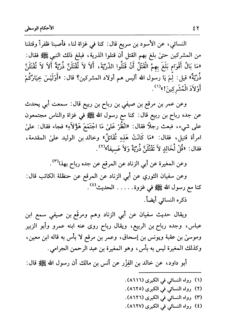النسائي، عن الأسود بن سريع قال: كنا في غزاة لنا، فأصبنا ظفرًا وقتلنا من المشركين حتى بلغ بهم القتل أن قتلوا الذرية، فبلغ ذلك النبي - صلى الله عليه وسلم - فقال: "مَا بَالُ أَقْوَامٍ بَلَغَ بِهِمُ الْقَتْلُ أَنْ قَتَلُوا الذّرِّيَةَ، أَلاَ لاَ تُقْتَلَنَّ ذُرِّيَةٌ أَلاَ لاَ تُقْتَلَنَّ ذُرِّيَةٌ" قيل: لِمَ يَا رسول الله أليس هم أولاد المشركين؟ قال: "أَوَلَيْسَ خِيَارُكُمْ أَوْلاَدَ الْمُشْرِكِينَ! " (¬1).