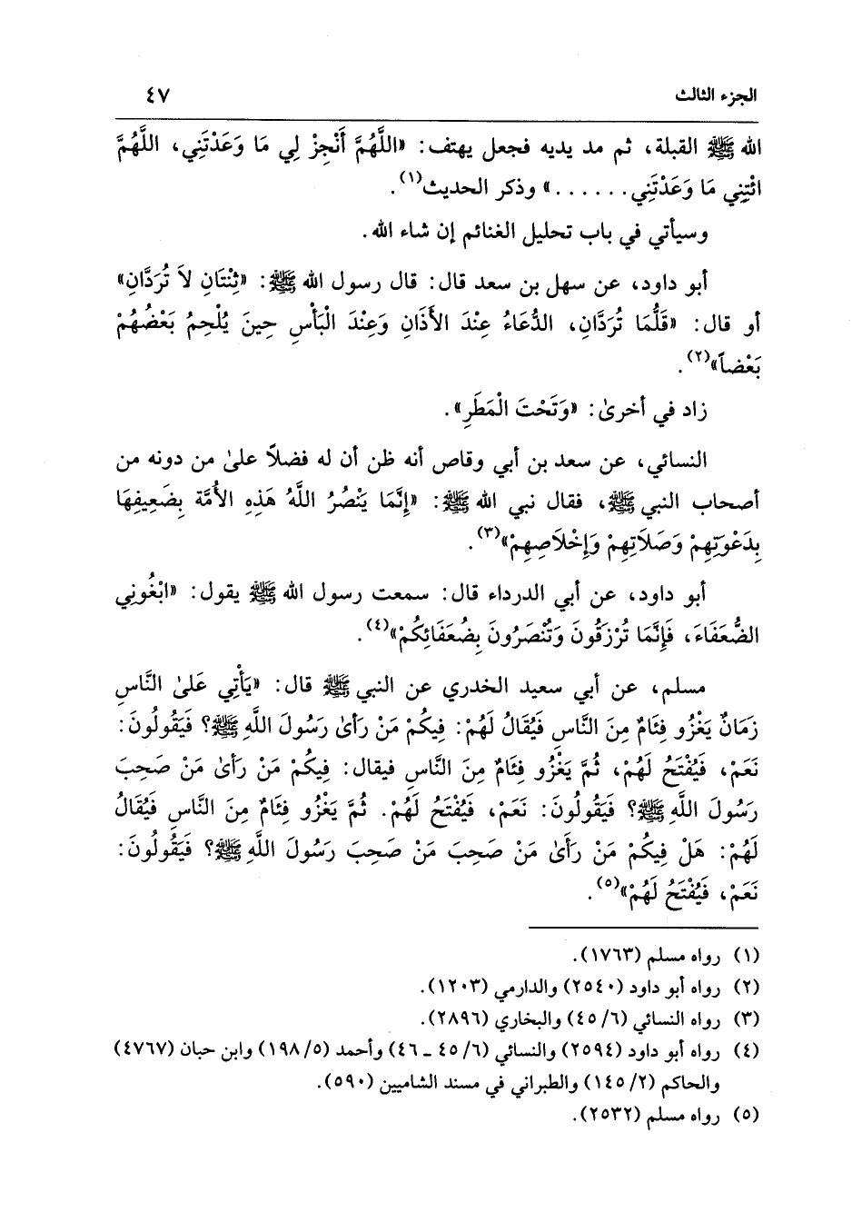 أبو داود، عن أبي الدرداء قال: سمعت رسول الله - صلى الله عليه وسلم - يقول: "ابْغُونِي الضُّعَفَاءَ، فَإنَّمَا تُرْزَقُونَ وَتنصَرُونَ بِضُعَفَائِكُمْ" (¬4).