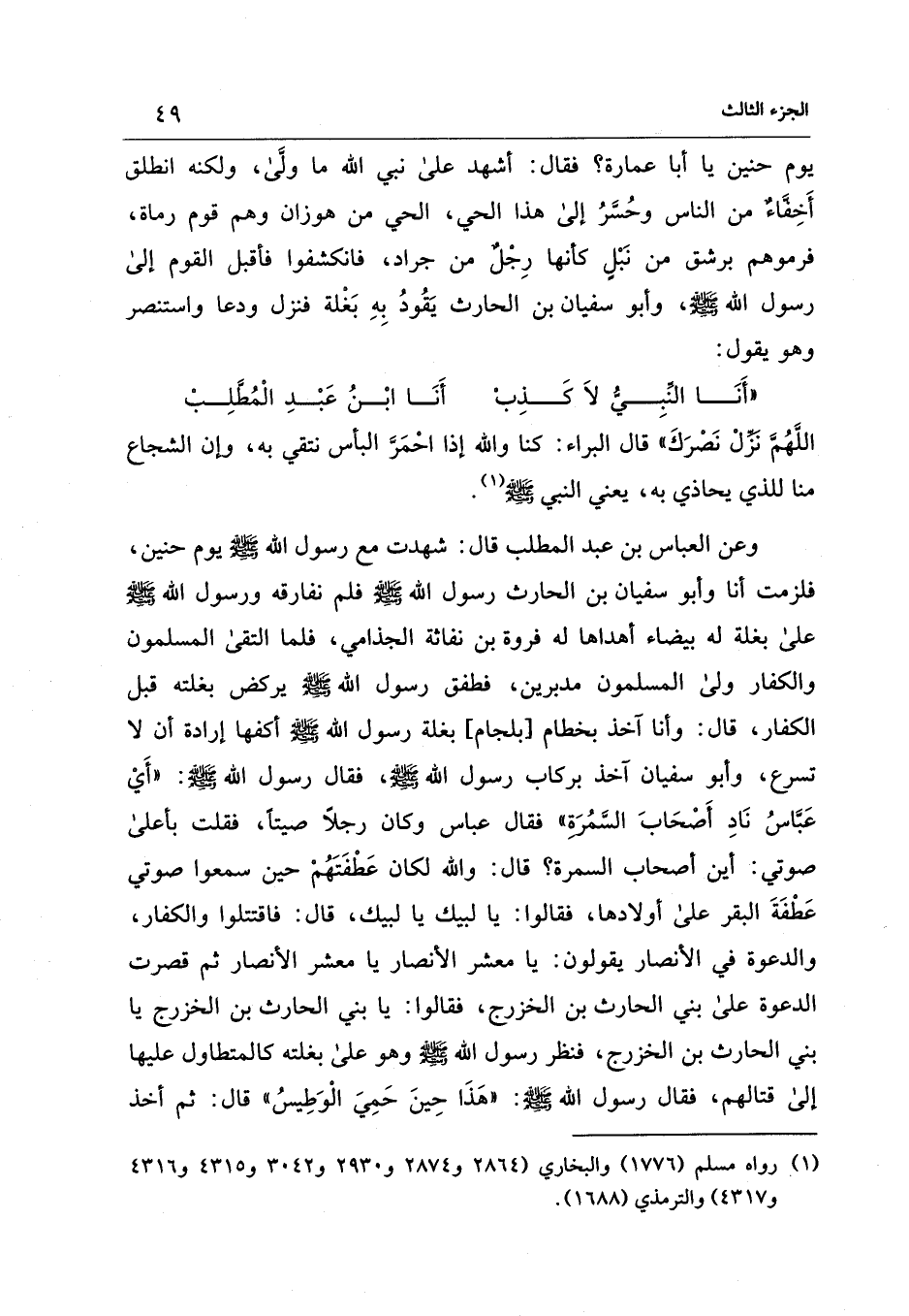 وعن العباس بن عبد المطلب قال: شهدت مع رسول الله - صلى الله عليه وسلم - يوم حنين، فلزمت أنا وأبو سفيان بن الحارث رسول الله - صلى الله عليه وسلم - فلم نفارقه ورسول الله - صلى الله عليه وسلم - على بغلة له بيضاء أهداها له فروة بن نفاثة الجذامي، فلما التقى المسلمون والكفار ولى المسلمون مدبرين، فطفق رسول الله - صلى الله عليه وسلم - يركض بغلته قبل الكفار، قال: وأنا آخذ بخطام [بلجام] بغلة رسول الله - صلى الله عليه وسلم - أكفها إرادة أن لا تسرع، وأبو سفيان آخذ بركاب رسول الله - صلى الله عليه وسلم -، فقال رسول الله - صلى الله عليه وسلم -: "أَيْ عَبَّاسُ نَادِ أَصْحَابَ السَّمُرَةِ" فقال عباس وكان رجلًا صيتًا، فقلت بأعلى صوتي: أين أصحاب السمرة؟ قال: والله لكان عَطْفَتَهُمْ حين سمعوا صوتي عَطْفَةَ البقر على أولادها، فقالوا: يا لبيك يا لبيك، قال: فاقتتلوا والكفار، والدعوة في الأنصار يقولون: يا معشر الأنصار يا معشر الأنصار ثم قصرت الدعوة علي بني الحارث بن الخزرج، فقالوا: يا بني الحارث بن الخزرج يا بني الحارث بن الخزرج، فنظر رسول الله - صلى الله عليه وسلم - وهو على بغلته كالمتطاول عليها إلى قتالهم، فقال رسول الله - صلى الله عليه وسلم -: "هَذَا حِينَ حَمِيَ الْوَطِيسُ" قال: ثم أخذ