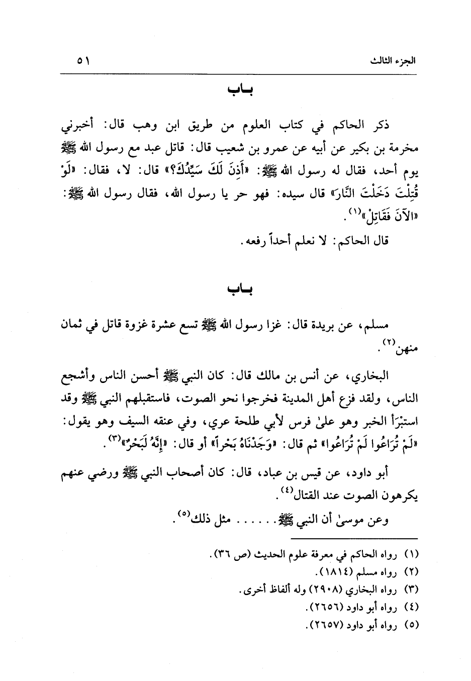 أبو داود، عن قيس بن عباد، قال: كان أصحاب النبي - صلى الله عليه وسلم - ورضي عنهم يكرهون الصوت عند القتال (¬4).