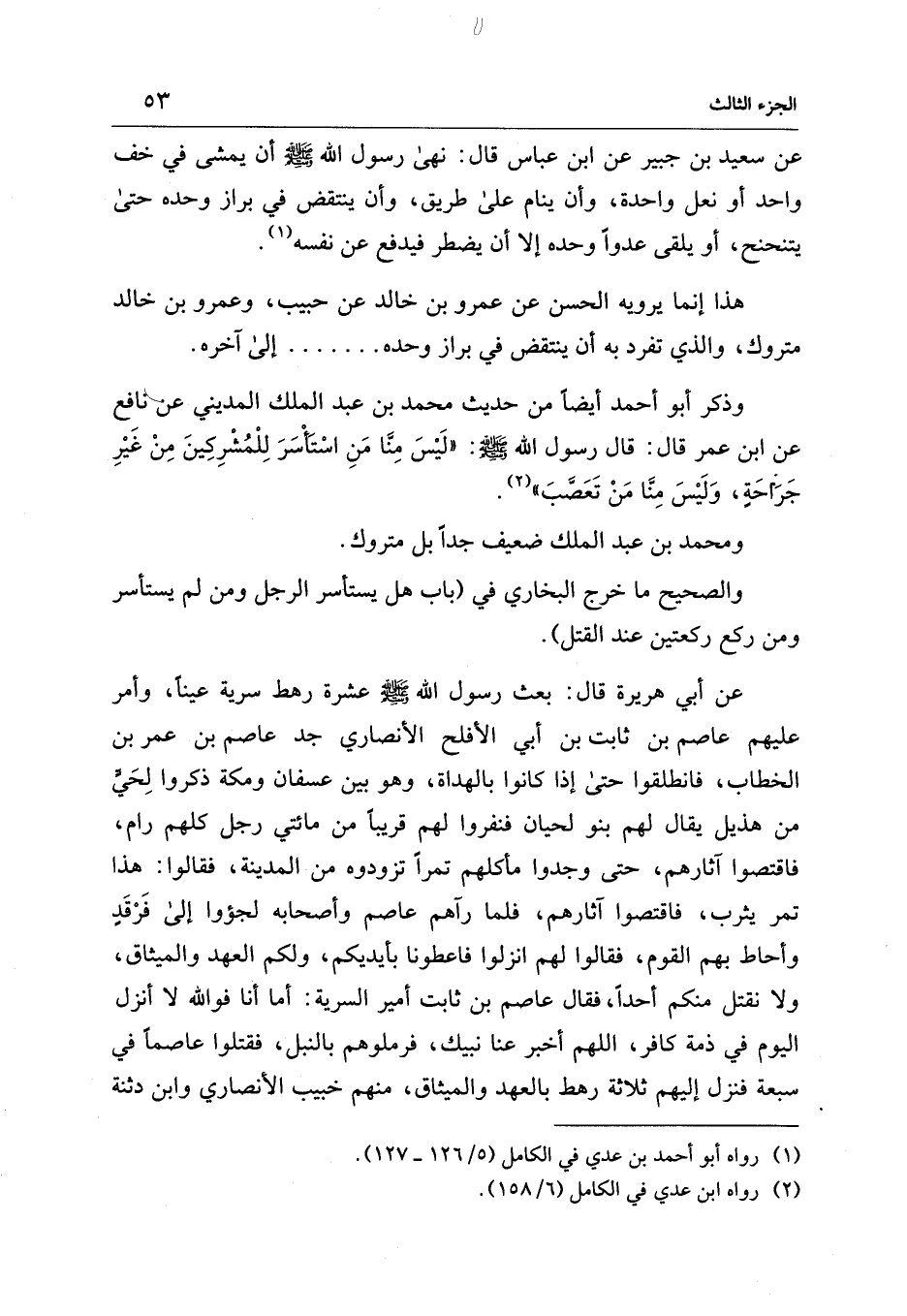 وذكر أبو أحمد أيضًا من حديث محمد بن عبد الملك المديني عن نافع عن ابن عمر قال: قال رسول الله - صلى الله عليه وسلم -: "لَيْسَ مِنَّا مَنِ اسْتَأْسَرَ لِلْمُشْرِكِينَ مِنْ غيْرِ جَرَاحَةٍ، وَلَيْسَ مِنَّا مَنْ تَعَصَّبَ" (¬2).