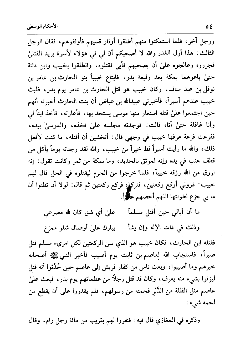 ورجل آخر، فلما استمكنوا منهم أطلقوا أوتار قسيهم فأوثقوهم، فقال الرجل الثالث: هذا أول الغدر والله لا أصحبكم أن لي في هؤلاء لأسوة يريد القتلى فجرروه وعالجوه على أن يصحبهم فأبى فقتلوه، وانطلقوا بخبيب وابن دثنة حتى باعوهما بمكة بعد وقيعة بدر، فابتاع خبيبًا بنو الحارث بن عامر بن نوفل بن عبد مناف، وكان خبيب هو قتل الحارث بن عامر يوم بدر، فلبث خبيب عندهم أسيرًا، فأخبرني عبيد الله بن عياض أن بنت الحارث أخبرته أنهم حين اجتمعوا على قتله استعار منها موسى يستحد بها، فأعارته، فأخذ ابنًا لي وأنا غافلة حتى أتاه قالت: فوجدته مجلسه على فخذه، والموسى بيده، ففزعت فزعة عرفها خُبيب في وجهي قال: أتخشين أن أقتله، ما كنت لأفعل ذلك، والله ما رأيت أسيرًا قط خيرًا من خبيب، والله لقد وجدته يومًا يأكل من قطف عنب في يده وإنه لموثق بالحديد، وما بمكة من ثمر وكانت تقول: إنه لرزق من الله رزقه خبيبًا، فلما: خرجوا من الحرم ليقتلوه في الحل قال لهم خبيب: ذروني أركع ركعتين، فتركوه فركع ركعتين ثم قال: لولا أن تظنوا أن ما بي جزع لطولتها اللهم أحصهم عددًا.