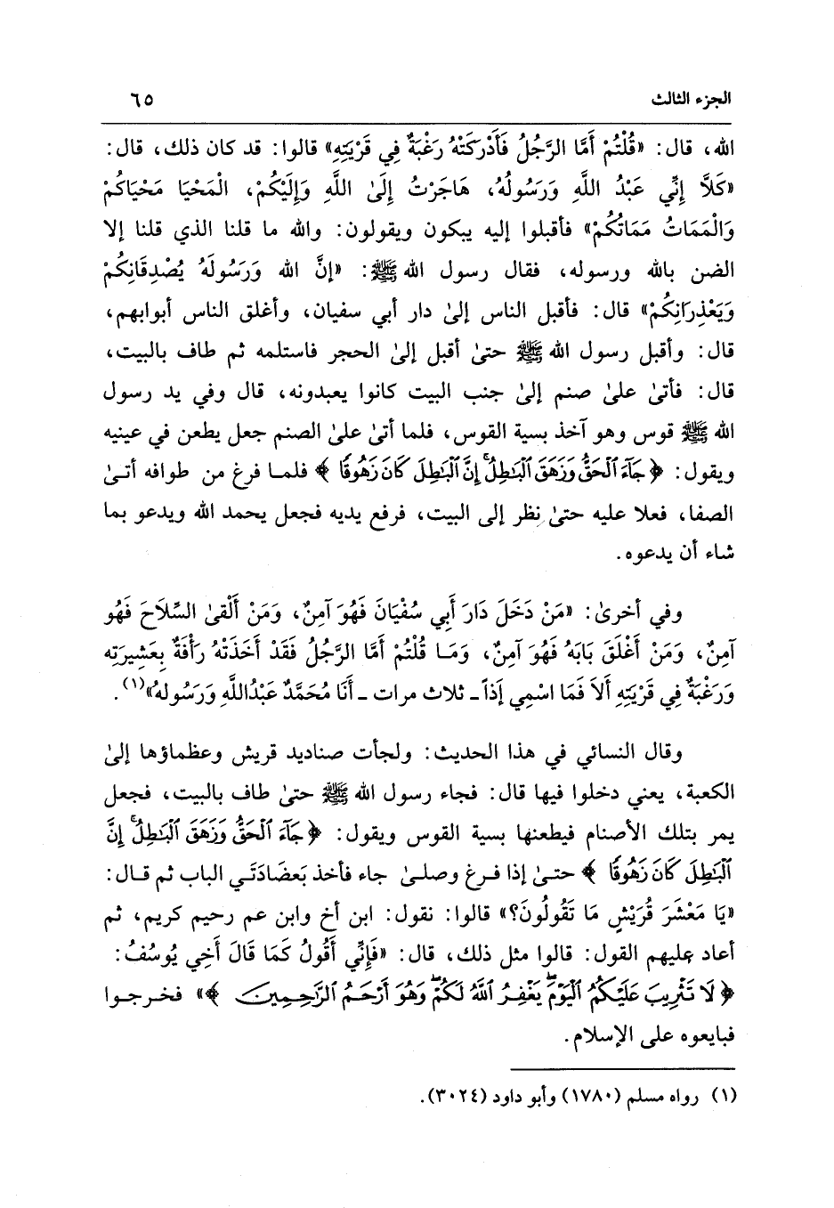 وقال النسائي في هذا الحديث: ولجأت صناديد قريش وعظماؤها إلى الكعبة، يعني دخلوا فيها قال: فجاء رسول الله - صلى الله عليه وسلم - حتى طاف بالبيت، فجعل يمر بتلك الأصنام فيطعنها بسية القوس ويقول: {جَاءَ الْحَقُّ وَزَهَقَ الْبَاطِلُ إِنَّ الْبَاطِلَ كَانَ زَهُوقًا} حتى إذا فرغ وصلى جاء فأخذ بَعضَادَتَي الباب ثم قال: "يَا مَعْشَرَ قُرَيْشِ مَا تَقُولُونَ؟ " قالوا: نقول: ابن أخ وابن عم رحيم كريم، ثم أعاد عليهم القول: قالوا مثل ذلك، قال: "فَإِنِّي أَقُولُ كمَا قَالَ أَخِي يُوسُفُ: {لَا تَثْرِيبَ عَلَيْكُمُ الْيَوْمَ يَغْفِرُ اللَّهُ لَكُمْ وَهُوَ أَرْحَمُ الرَّاحِمِينَ} " فخرجوا فبايعوه على الإسلام.