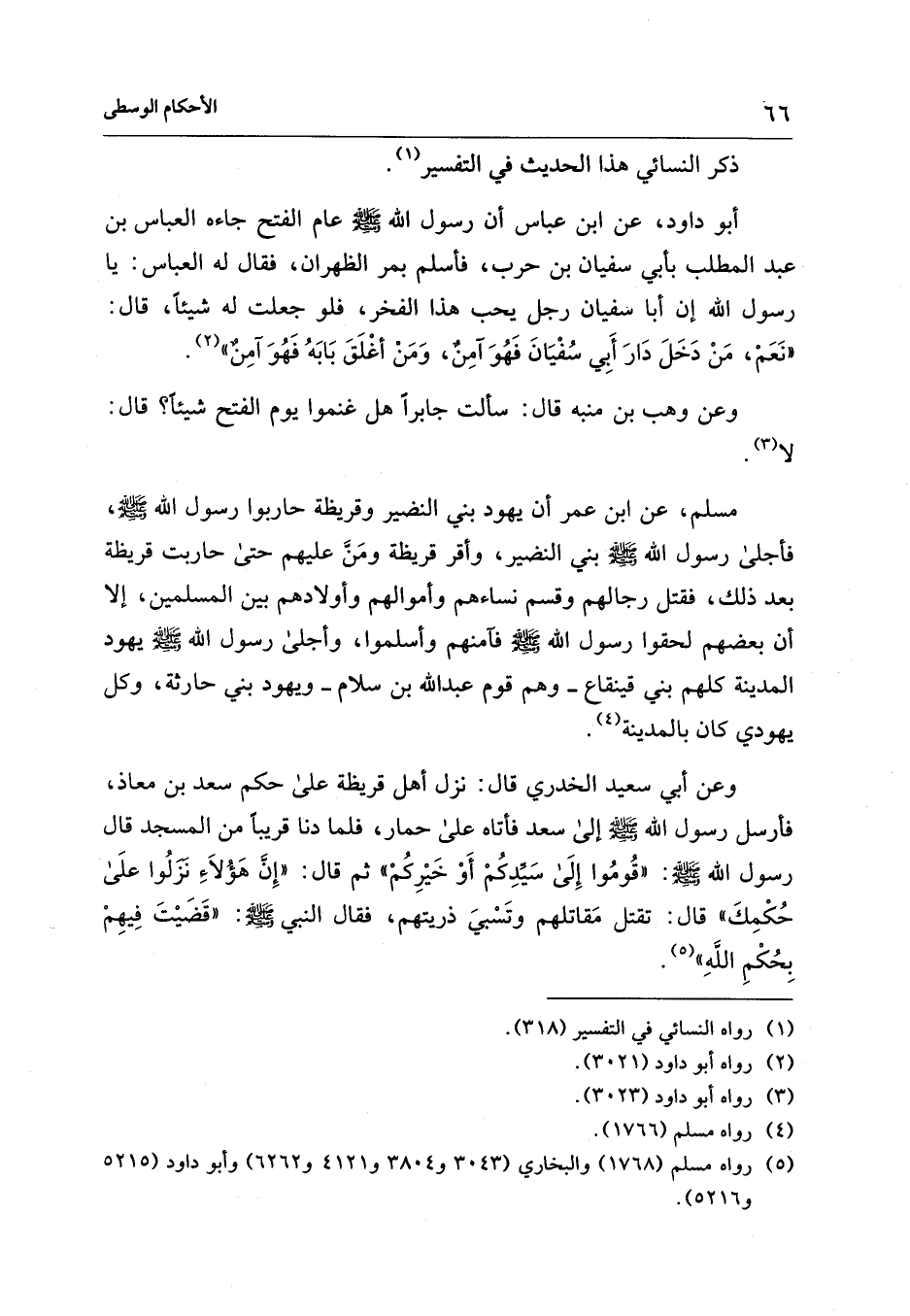 مسلم، عن ابن عمر أن يهود بني النضير وقريظة حاربوا رسول الله - صلى الله عليه وسلم -، فأجلى رسول الله - صلى الله عليه وسلم - بني النضير، وأقر قريظة ومَنَّ عليهم حتى حاربت قريظة بعد ذلك، فقتل رجالهم وقسم نساءهم وأموالهم وأولادهم بين المسلمين، إلا أن بعضهم لحقوا رسول الله - صلى الله عليه وسلم - فآمنهم وأسلموا، وأجلى رسول الله - صلى الله عليه وسلم - يهود المدينة كلهم بني قينقاع -وهم قوم عبد الله بن سلام- ويهود بني حارثة، وكل يهودي كان بالمدينة (¬4).