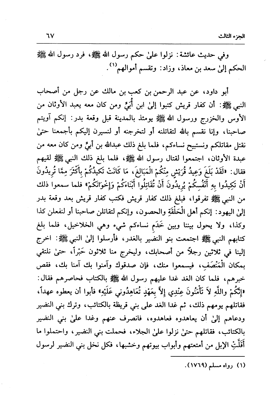 وفي حديث عائشة: نزلوا على حكم رسول الله - صلى الله عليه وسلم -، فرد رسول الله - صلى الله عليه وسلم - الحكم إلى سعد بن معاذ، وزاد: وتقسم أموالهم (¬1).