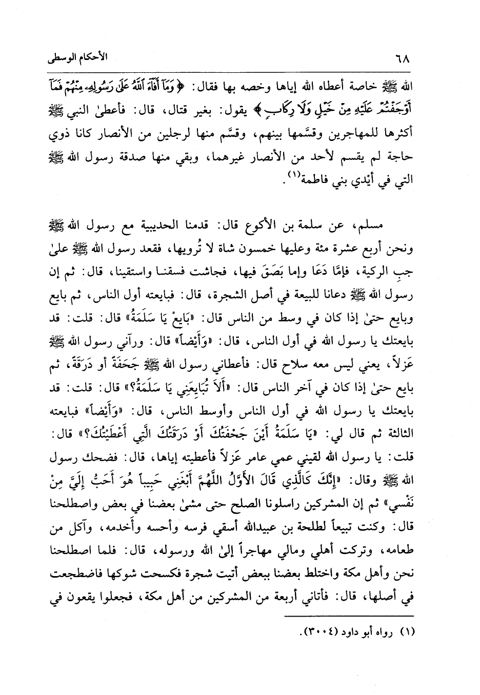 مسلم، عن سلمة بن الأكوع قال: قدمنا الحديبية مع رسول الله - صلى الله عليه وسلم - ونحن أربع عشرة مئة وعليها خمسون شاة لا تُرويها، فقعد رسول الله - صلى الله عليه وسلم - على جبِ الركية، فإمَّا دَعَا وإما بَصَقَ فيها، فجاشت فسقنا واستقينا، قال: ثم إن رسول الله - صلى الله عليه وسلم - دعانا للبيعة في أصل الشجرة، قال: فبايعته أول الناس، ثم بايع وبايع حتى إذا كان في وسط من الناس قال: "بَايِعْ يَا سَلَمَةُ" قال: قلت: قد بايعتك يا رسول الله في أول الناس، قال: "وَأَيْضًا" قال: ورآني رسول الله - صلى الله عليه وسلم - عَزلًا، يعني ليس معه سلاح قال: فأعطاني رسول الله - صلى الله عليه وسلم - جَحَفَةً أو دَرَقَةً، ثم بايع حتى إذا كان في آخر الناس قال: "أَلاَ تُبَايِعَنِي يَا سَلَمَةُ؟ " قال: قلت: قد بايعتك يا رسول الله في أول الناس وأوسط الناس، قال: "وَأَيْضًا" فبايعته الثالثة ثم قال لي: "يَا سَلَمَةُ أَيْنَ جَحْفَتُكَ أَوْ دَرَقَتُكَ الَّتِي أَعْطَيْتُكَ؟ " قال: قلت: يا رسول الله لقيني عمي عامر عَزلًا فأعطيته إياها، قال: فضحك رسول الله - صلى الله عليه وسلم - وقال: "إِنَّكَ كَالَّذِي قَالَ الأَوَّلُ اللَّهُمَّ أَبْغَنِي حَبِيبًا هُوَ أَحَبُّ إِلَيَّ مِنْ نَفْسي" ثم إن المشركين راسلونا الصلح حتى مشى بعضنا في بعض واصطلحنا قال: وكنت تبيعًا لطلحة بن عبيد الله أسقي فرسه وأحسه وأَخدمه، وآكل من طعامه، وتركت أهلي ومالي مهاجرًا إلى الله ورسوله، قال: فلما اصطلحنا نحن وأهل مكة واختلط بعضنا ببعض أتيت شجرة فكسحت شوكها فاضطجعت فى أصلها، قال: فأتاني أربعة من المشركين من أهل مكة، فجعلوا يقعون في