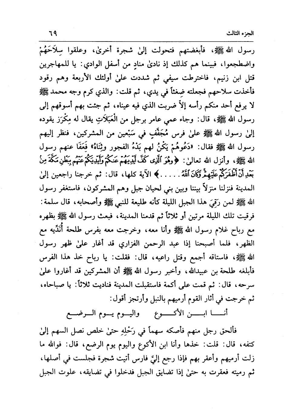 سرحه، قال: ثم قمت على أكمة فاستقبلت المدينة فناديت ثلاثًا: يا صباحاه، ثم خرجت في أثار القوم أرميهم بالنبل وأرتجز أقول: