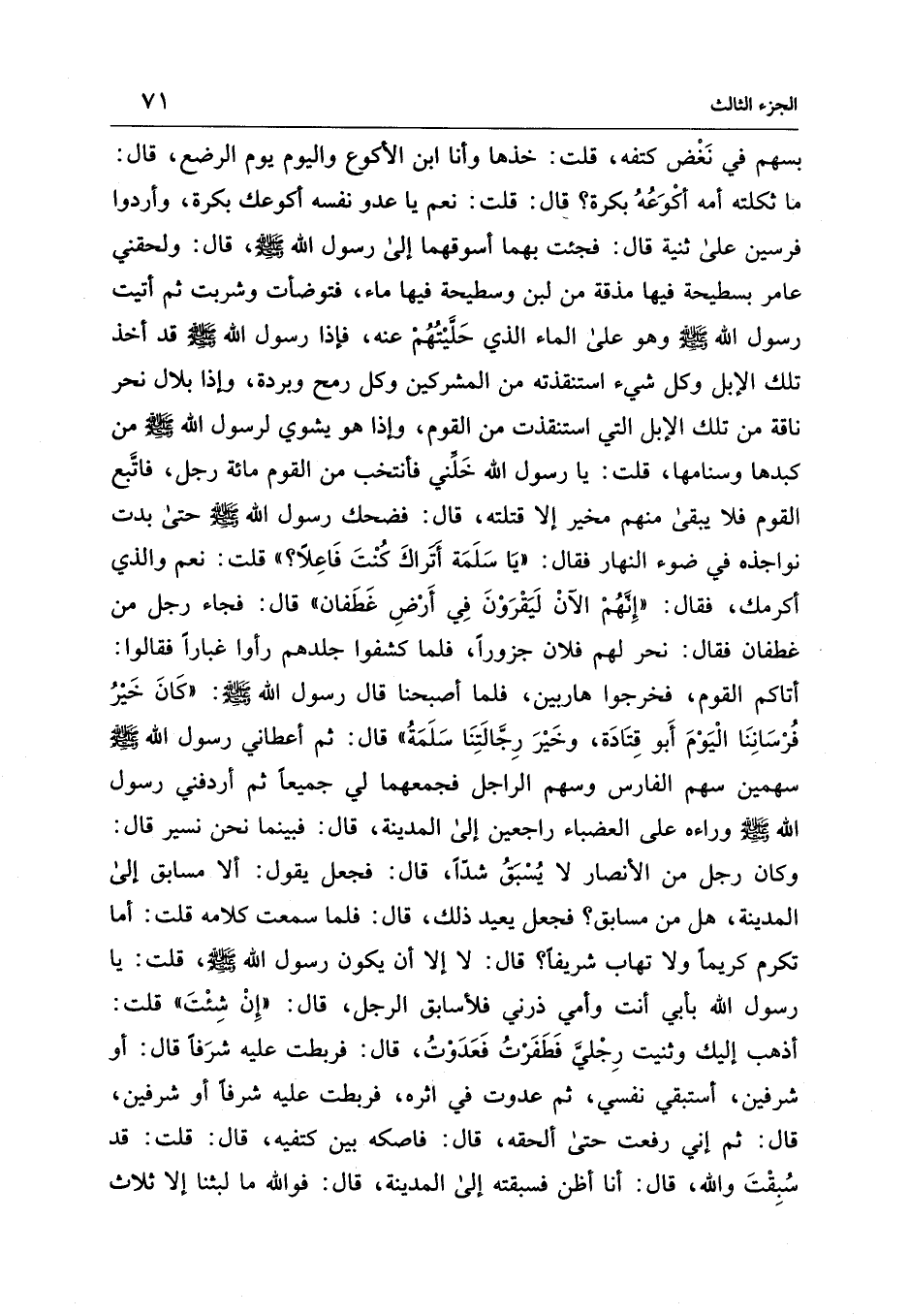 بسهم في نَغْض كتفه، قلت: خذها وأنا ابن الأكوع واليوم يوم الرضع، قال: ما ثكلته أمه أكْوَعُهُ بكرة؟ قال: قلت: نعم يا عدو نفسه أكوعك بكرة، وأردوا فرسين على ثنية قال: فجئت بهما أسوقهما إلى رسول الله - صلى الله عليه وسلم -، قال: ولحقني عامر بسطيحة فيها مذقة من لبن وسطيحة فيها ماء، فتوضأت وشربت ثم أتيت رسول الله - صلى الله عليه وسلم - وهو على الماء الذي حَلَّيْتُهُمْ عنه، فإذا رسول الله - صلى الله عليه وسلم - قد أخذ تلك الإبل وكل شيء استنقذته من المشركين وكل رمح وبردة، وإذا بلال نحر ناقة من تلك الإبل التي استنقذت من القوم، وإذا هو يشوي لرسول الله - صلى الله عليه وسلم - من كبدها وسنامها، قلت: يا رسول الله خَلِّني فأنتخب من القوم مائة رجل، فاتَّبع القوم فلا يبقى منهم مخير إلا قتلته، قال: فضحك رسول الله - صلى الله عليه وسلم - حتى بدت نواجذه في ضوء النهار فقال: "يَا سَلَمَة أتَراكَ كُنْتَ فَاعِلًا؟ " قلت: نعم والذي أكرمك، فقال: "إِنَّهُمْ الآنْ لَيَقْرَوْنَ فِي أَرْضِ غَطَفان" قال: فجاء رجل من غطفان فقال: نحر لهم فلان جزورًا، فلما كشفوا جلدهم رأوا غبارًا فقالوا: أتاكم القوم، فخرجوا هاربين، فلما أصبحنا قال رسول الله - صلى الله عليه وسلم -: "كَانَ خَيْرُ فُرْسَانِنَا الْيَوْمَ أَبو قِتَادَة، وخَيْرَ رِجَّالَتِنَا سَلَمَةُ" قال: ثم أعطاني رسول الله - صلى الله عليه وسلم - سهمين سهم الفارس وسهم الراجل فجمعهما لي جميعًا ثم أردفني رسول الله - صلى الله عليه وسلم - وراءه على العضباء راجعين إلى المدينة، قال: فبينما نحن نسير قال: وكان رجل من الأنصار لا يُسْبَقُ شدًّا، قال: فجعل يقول: ألا مسابق إلى المدينة، هل من مسابق؟ فجعل يعيد ذلك، قال: فلما سمعت كلامه قلت: أما تكرم كريمًا ولا تهاب شريفًا؟ قال: لا إلا أن يكون رسول الله - صلى الله عليه وسلم -، قلت: يا رسول الله بأبي أنت وأمي ذرني فلأسابق الرجل، قال: "إِنْ شِئْتَ" قلت: أذهب إليك وثنيت رِجْليَّ فَطَفَرْتُ فَعَدَوْتُ، قال: فربطت عليه شرفًا قال: أو شرفين، أستبقي نفسي، ثم عدوت في اثره، فربطت عليه شرفًا أو شرفين، قال: ثم إني رفعت حتى ألحقه، قال: فاصكه بين كتفيه، قال: قلت: قد سُبِقْتَ والله، قال: أنا أظن فسبقته إلى المدينة، قال: فوالله ما لبثنا إلا ثلاث