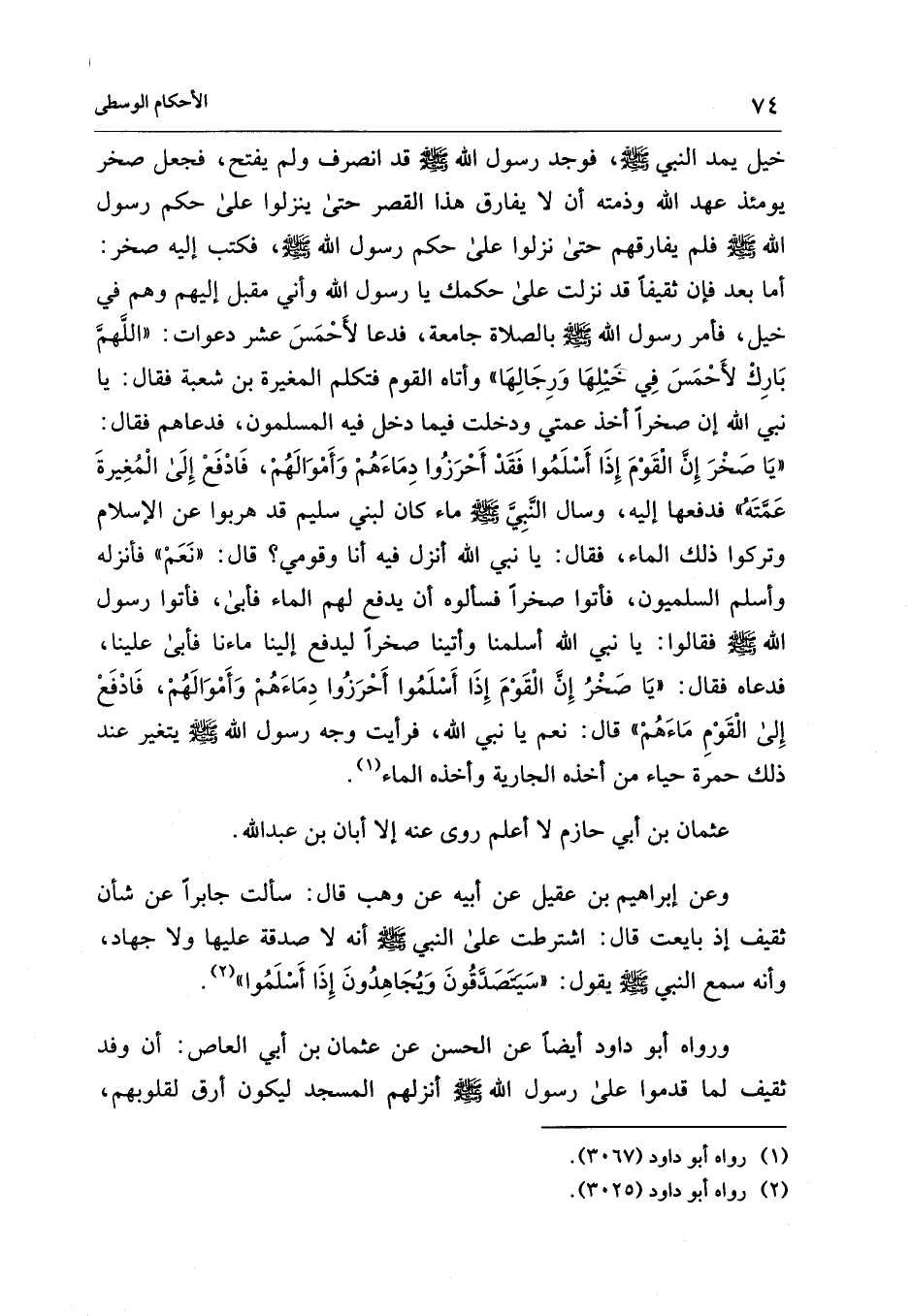 خيل يمد النبي - صلى الله عليه وسلم -، فوجد رسول الله - صلى الله عليه وسلم - قد انصرف ولم يفتح، فجعل صخر يومئذ عهد الله وذمته أن لا يفارق هذا القصر حتى ينزلوا على حكم رسول الله - صلى الله عليه وسلم - فلم يفارقهم حتى نزلوا على حكم رسول الله - صلى الله عليه وسلم -، فكتب إليه صخر: أما بعد فإن ثقيفًا قد نزلت على حكمك يا رسول الله وأني مقبل إليهم وهم في خيل، فأمر رسول الله - صلى الله عليه وسلم - بالصلاة جامعة، فدعا لأَحْمَسَ عشر دعوات: "اللَّهمَّ بَارِكْ لأَحْمَسَ فِي خيْلِهَا وَرِجَالِهَا" وأتاه القوم فتكلم المغيرة بن شعبة فقال: يا نبي الله إن صخرًا أخذ عمتي ودخلت فيما دخل فيه المسلمون، فدعاهم فقال: "يَا صَخْرَ إِنَّ الْقَوْمَ إِذَا أَسْلَمُوا فَقَدْ أَحْرَزُوا دِمَاءَهُمْ وَأَمْوَالَهُمْ، فَادْفَعْ إِلَى الْمُغِيرةَ عَمَّتَهُ" فدفعها إليه، وسال النَّبِيَّ - صلى الله عليه وسلم - ماء كان لبني سليم قد هربوا عن الإسلام وتركوا ذلك الماء، فقال: يا نبي الله أنزل فيه أنا وقومي؟ قال: "نَعَمْ" فأنزله وأسلم السلميون، فأتوا صخرًا فسألوه أن يدفع لهم الماء فأبى، فأتوا رسول الله - صلى الله عليه وسلم - فقالوا: يا نبي الله أسلمنا وأتينا صخرًا ليدفع إلينا ماءنا فأبى علينا، فدعاه فقال: "يَا صَخْرُ إِنَّ الْقَوْمَ إِذَا أَسْلَمُوا أَحْرَزُوا دِمَاءَهُمْ وَأَمْوَالَهُمْ، فَادْفَعْ إِلى الْقَوْمِ مَاءَهُمْ" قال: نعم يا نبي الله، فرأيت وجه رسول الله - صلى الله عليه وسلم - يتغير عند ذلك حمرة حياء من أخذه الجارية وأخذه الماء (¬1).