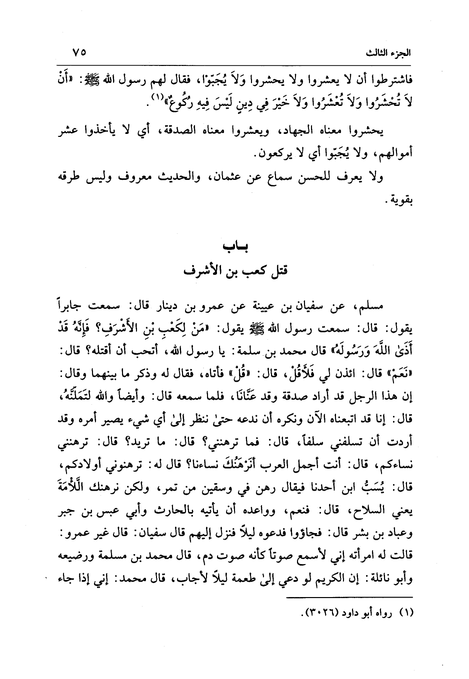 مسلم، عن سفيان بن عيينة عن عمرو بن دينار قال: سمعت جابرًا يقول: قال: سمعت رسول الله - صلى الله عليه وسلم - يقول: "مَنْ لِكَعْبِ بْنِ الأَشْرَفِ؟ فَإِنَّهُ قَدْ أَذَى اللهَ وَرَسُولَهُ" قال محمد بن سلمة: يا رسول الله، أتحب أن أقتله؟ قال: "نَعَمْ" قال: ائذن لي فَلأَقُلْ، قال: "قُلْ" فأتاه، فقال له وذكر ما بينهما وقال: إن هذا الرجل قد أراد صدقة وقد عَنَّانَا، فلما سمعه قال: وأيضًا والله لتَمَلّنَّهُ، قال: إنا قد اتبعناه الآن ونكره أن ندعه حتى ننظر إلى أي شيء يصير أمره وقد أردت أن تسلفني سلفًا، قال: فما ترهنني؟ قال: ما تريد؟ قال: ترهنني نساءكم، قال: أنت أجمل العرب أنَرْهَنُكَ نساءنا؟ قال له: ترهنوني أولادكم، قال: يُسَبُّ ابن أحدنا فيقال رهن في وسقين من تمر، ولكن نرهنك الَّلأْمَةَ يعني السلاح، قال: فنعم، وواعده أن يأتيه بالحارث وأبي عبس بن جبر وعباد بن بشر قال: فجاؤوا فدعوه ليلًا فنزل إليهم قال سفيان: قال غير عمرو: قالت له امرأته إني لأسمع صوتًا كأنه صوت دم، قال محمد بن مسلمة ورضيعه وأبو نائلة: إن الكريم لو دعي إلى طعمة ليلًا لأجاب، قال محمد: إني إذا جاء