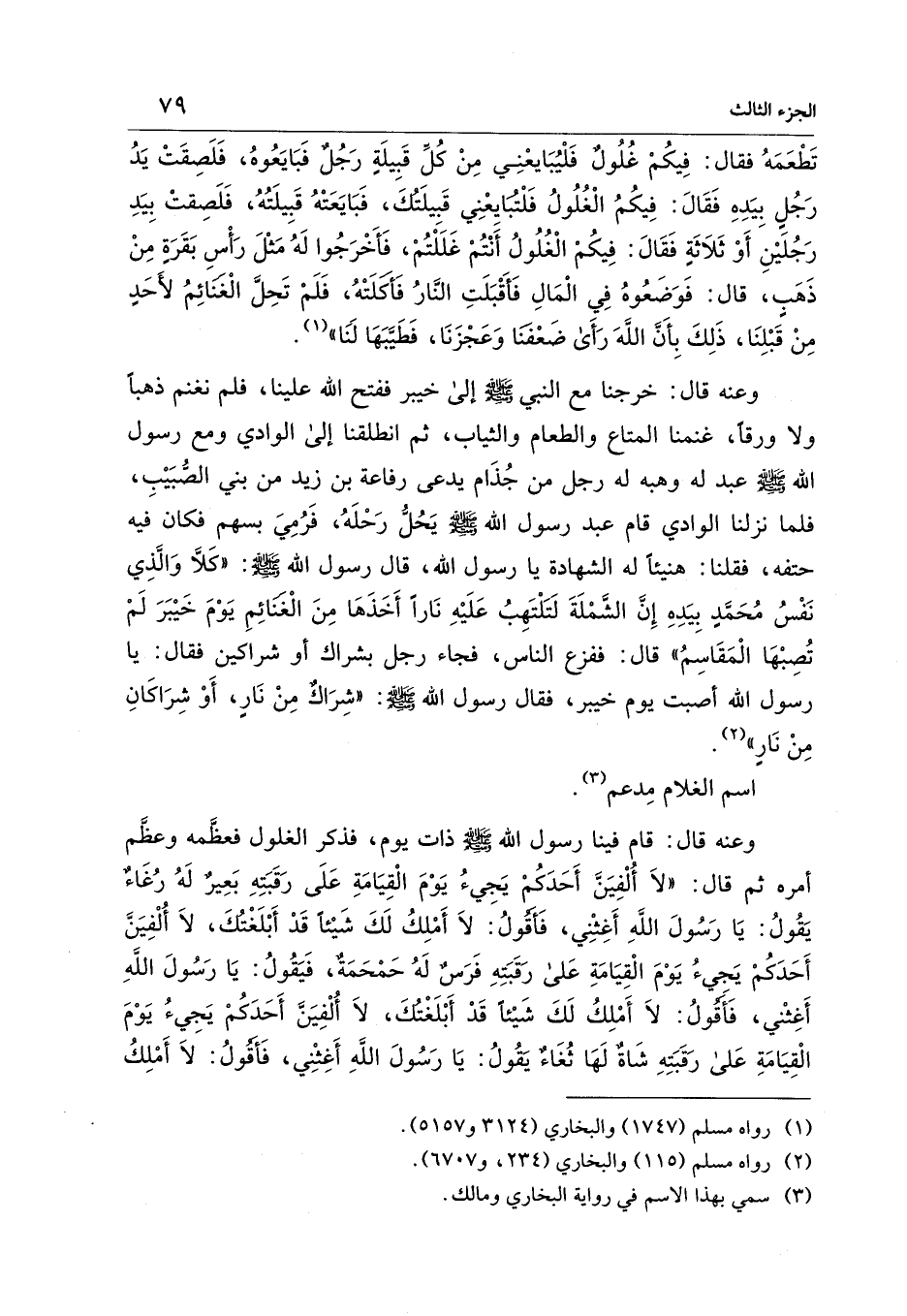 وعنه قال: خرجنا مع النبي - صلى الله عليه وسلم - إلى خيبر ففتح الله علينا، فلم نغنم ذهبًا ولا ورقًا، غنمنا المتاع والطعام والثياب، ثم انطلقنا إلى الوادي ومع رسول الله - صلى الله عليه وسلم - عبد له وهبه له رجل من جُذَام يدعى رفاعة بن زيد من بني الصُّبَيْبِ، فلما نزلنا الوادي قام عبد رسول الله - صلى الله عليه وسلم - يَحُلُّ رَحْلَهُ، فَرُمِيَ بسهم فكان فيه حتفه، فقلنا: هنيئًا له الشهادة يا رسول الله، قال رسول الله - صلى الله عليه وسلم -: "كَلَّا وَالَّذِي نَفْسُ مُحَمَّدٍ بِيَدِهِ إِنَّ الشَّمْلَةَ لَتَلْتَهِبُ عَلَيْهِ نَارًا أَخَذَهَا مِنَ الْغنَائِمِ يَوْمَ خَيْبَرَ لَمْ تُصِبْهَا الْمَقَاسِمُ" قال: ففزع الناس، فجاء رجل بشراك أو شراكين فقال: يا رسول الله أصبت يوم خيبر، فقال رسول الله - صلى الله عليه وسلم -: "شِرَاكٌ مِنْ نَارٍ، أَوْ شِرَاكَانِ مِنْ نَارٍ" (¬2).