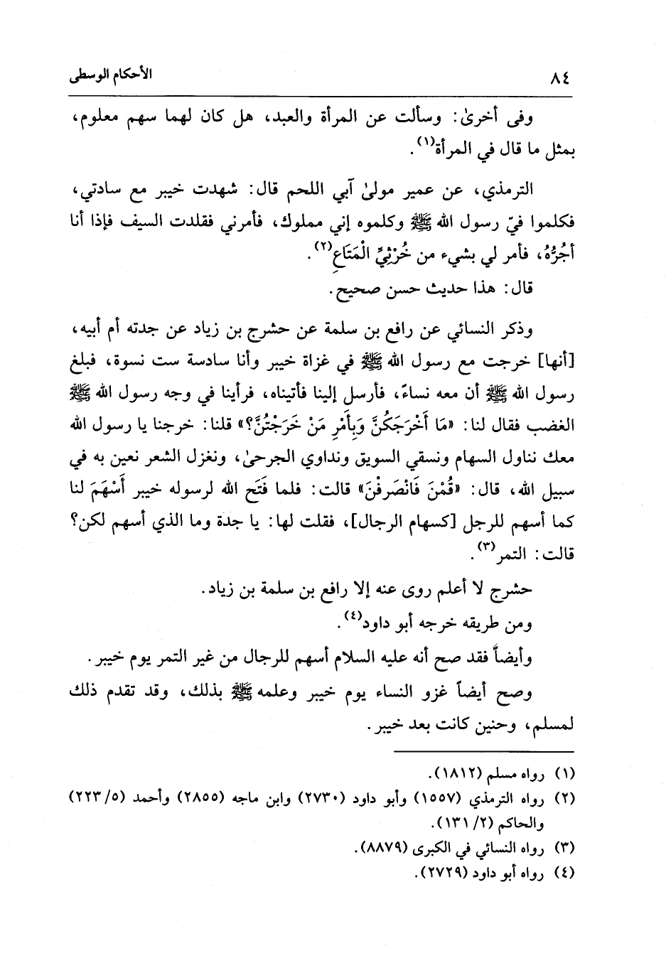 وذكر النسائي عن رافع بن سلمة عن حشرج بن زياد عن جدته أم أبيه، [أنها] خرجت مع رسول الله - صلى الله عليه وسلم - في غزاة خيبر وأنا سادسة ست نسوة، فبلغ رسول الله - صلى الله عليه وسلم - أن معه نساءً، فأرسل إلينا فأتيناه، فرأينا في وجه رسول الله - صلى الله عليه وسلم - الغضب فقال لنا: "مَا أَخْرَجَكُنَّ وَبِأَمْرِ مَنْ خَرَجْتُنَّ؟ " قلنا: خرجنا يا رسول الله معك نناول السهام ونسقي السويق ونداوي الجرحى، ونغزل الشعر نعين به في سبيل الله، قال: "قُمْنَ فَانْصَرفْنَ" قالت: فلما فَتَح الله لرسوله خيبر أَسْهَمَ لنا كما أسهم للرجل [كسهام الرجال]، فقلت لها: يا جدة وما الذي أسهم لكن؟ قالت: التمر (¬3).
