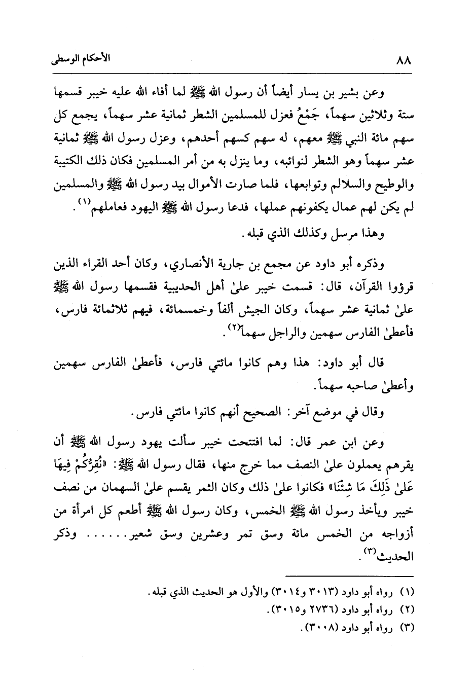 وعن بشير بن يسار أيضًا أن رسول الله - صلى الله عليه وسلم - لما أفاء الله عليه خيبر قسمها ستة وثلاثين سهمًا، جَمْعُ فعزل للمسلمين الشطر ثمانية عشر سهمًا، يجمع كل سهم مائة النبي - صلى الله عليه وسلم - معهم، له سهم كسهم أحدهم، وعزل رسول الله - صلى الله عليه وسلم - ثمانية عشر سهمًا وهو الشطر لنوائبه، وما ينزل به من أمر المسلمين فكان ذلك الكتيبة والوطيح والسلالم وتوابعها، فلما صارت الأموال بيد رسول الله - صلى الله عليه وسلم - والمسلمين لم يكن لهم عمال يكفونهم عملها، فدعا رسول الله - صلى الله عليه وسلم - اليهود فعاملهم (¬1).