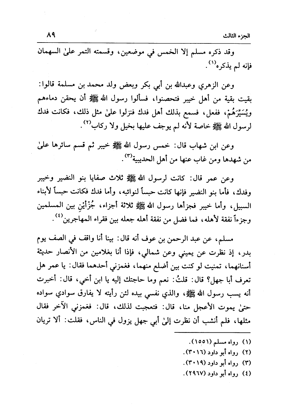 وعن عمر قال: كانت لرسول الله - صلى الله عليه وسلم - ثلاث صفايا بنو النضير وخيبر وفدك، فأما بنو النضير فإنها كانت حبسًا لنوائبه، وأما فدك فكانت حبسًا لأبناء السبيل، وأما خيبر فجزأها رسول الله - صلى الله عليه وسلم - ثلاثة أجزاء، جُزْأيْنِ بين المسلمين وجزءًا نفقة لأهله، فما فضل من نفقة أهله جعله بين فقراء المهاجرين (¬4).