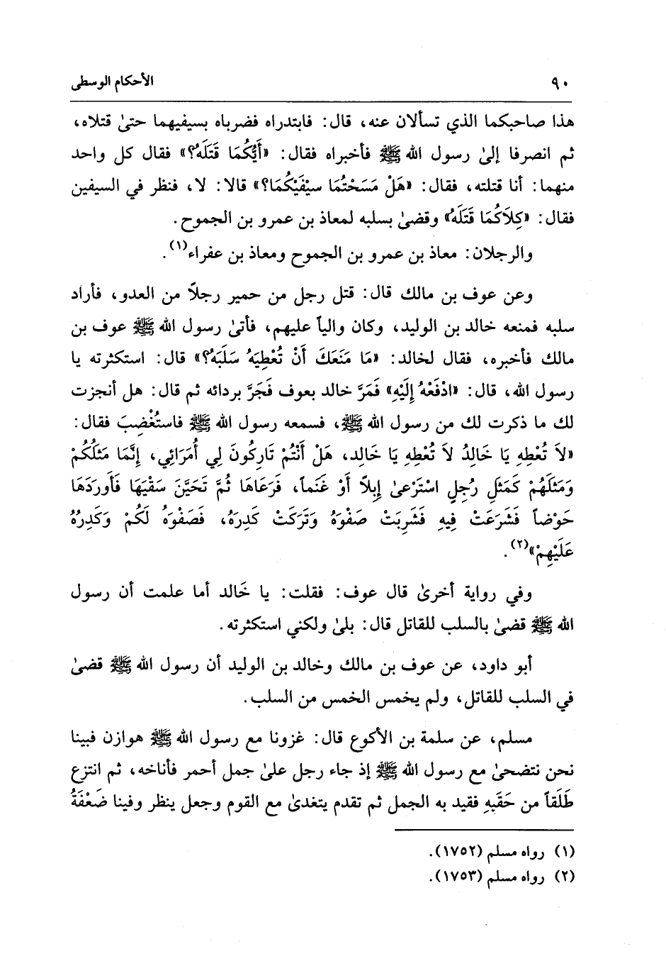وفي رواية أخرى قال عوف: فقلت: يا خَالد أما علمت أن رسول الله - صلى الله عليه وسلم - قضى بالسلب للقاتل قال: بلى ولكني استكثرته.