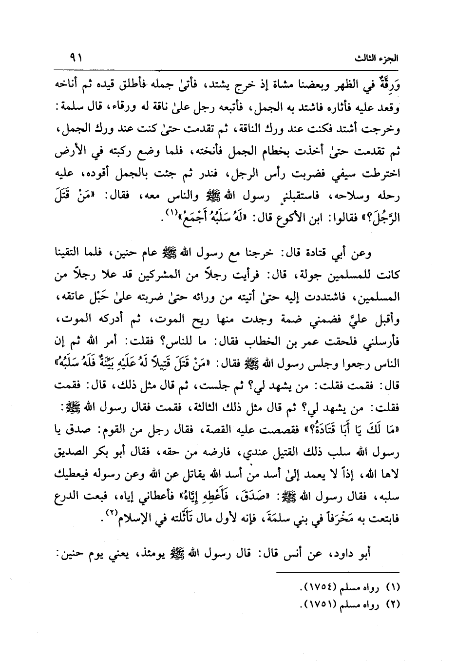 وعن أبي قتادة قال: خرجنا مع رسول الله - صلى الله عليه وسلم - عام حنين، فلما التقينا كانت للمسلمين جولة، قال: فرأيت رجلًا من المشركين قد علا رجلًا من المسلمين، فاشتددت إليه حتى أتيته من ورائه حتى ضربته على حَبْل عاتقه، وأقبل عليَّ فضمني ضمة وجدت منها ريح الموت، ثم أدركه الموت، فأرسلني فلحقت عمر بن الخطاب فقال: ما للناس؟ فقلت: أمر الله ثم إن الناس رجعوا وجلس رسول الله - صلى الله عليه وسلم - فقال: "مَنْ قَتلَ قَتِيلًا لَهُ عَلَيْهِ بَيِّنَةٌ فَلَهُ سَلَبُهُ" قال: فقمت فقلت: من يشهد لي؟ ثم جلست، ثم قال مثل ذلك، قال: فقمت فقلت: من يشهد لي؟ ثم قال مثل ذلك الثالثة، فقمت فقال رسول الله - صلى الله عليه وسلم -: "مَا لَكَ يَا أَبَا قَتَادَةُ؟ " فقصصت عليه القصة، فقال رجل من القوم: صدق يا رسول الله سلب ذلك القتيل عندي، فارضه من حقه، فقال أبو بكر الصديق لاها الله، إذًا لا يعمد إلى أسد من أسد الله يقاتل عن الله وعن رسوله فيعطيك سلبه، فقال رسول الله - صلى الله عليه وسلم -: "صَدَقَ، فَأَعْطِهِ إِيَّاهُ" فأعطاني إياه، فبعت الدرع فابتعت به مَخْرَفًا في بني سلمَةَ، فإنه لأول مال تَأَثّلته في الإسلام (¬2).