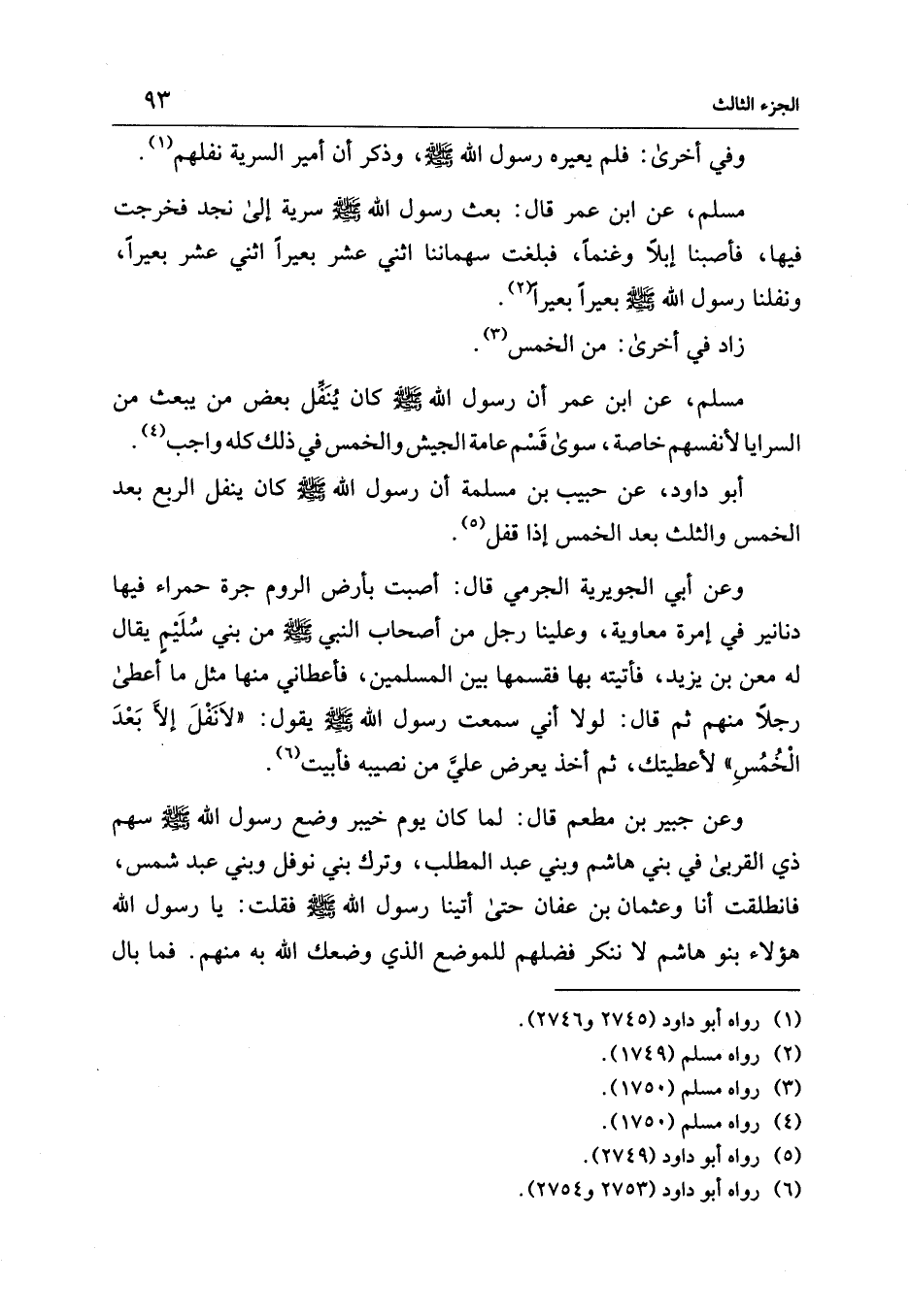 مسلم، عن ابن عمر أن رسول الله - صلى الله عليه وسلم - كان يُنَفِّل بعض من يبعث من السرايا لأنفسهم خاصة، سوى قَسْم عامة الجيش والخمس في ذلك كله واجب (¬4).