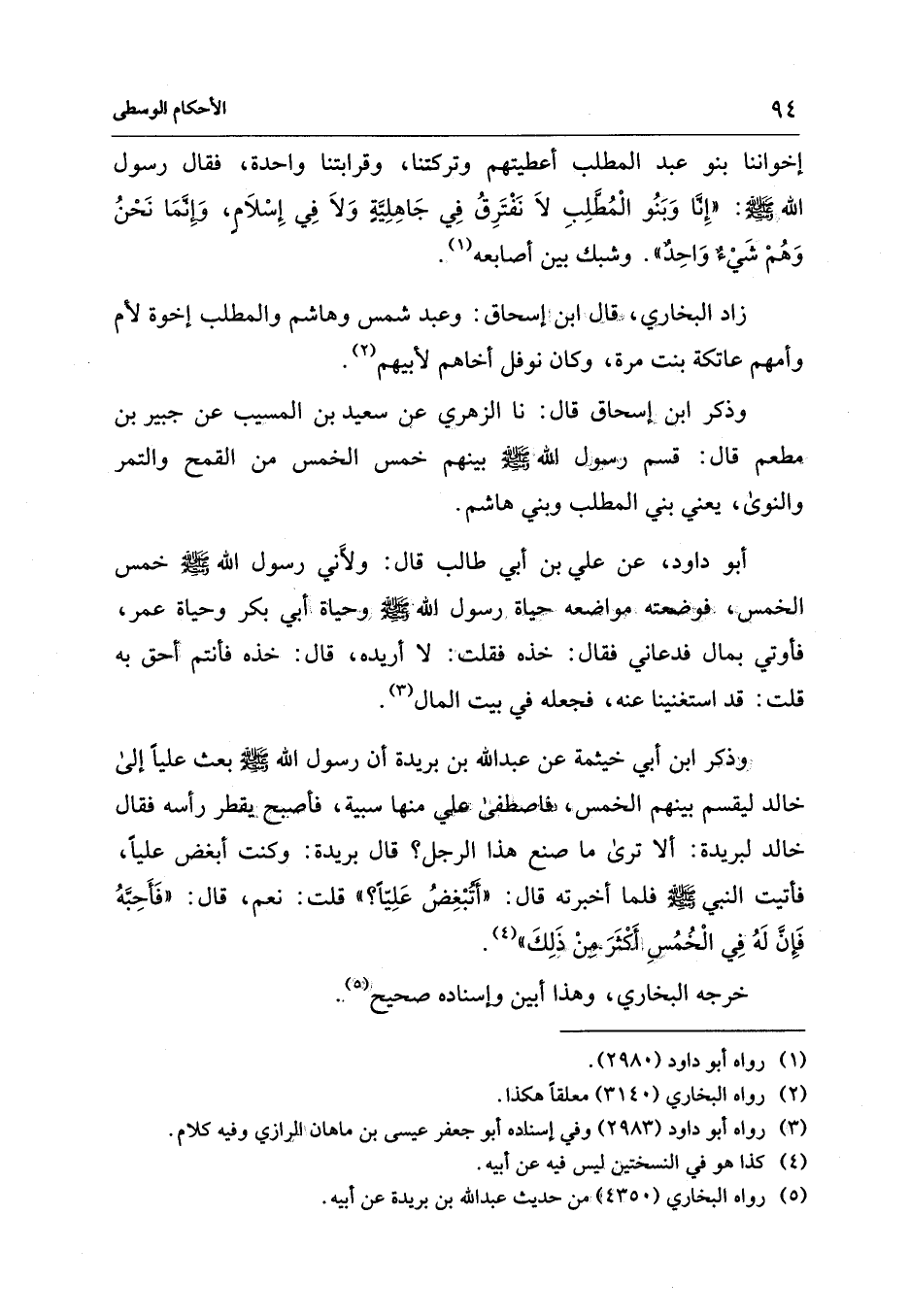 إخواننا بنو عبد المطلب أعطيتهم وتركتنا، وقرابتنا واحدة، فقال رسول الله - صلى الله عليه وسلم -: "إِنَّا وَبَنُو الْمُطَّلِبِ لاَ نَفْتَرِقُ فِي جَاهِلِيَّةٍ وَلاَ فِي إِسْلَامٍ، وَإنَّمَا نَحْنُ وَهُمْ شَيْءٌ وَاحِدٌ". وشبك بين أصابعه (¬1).