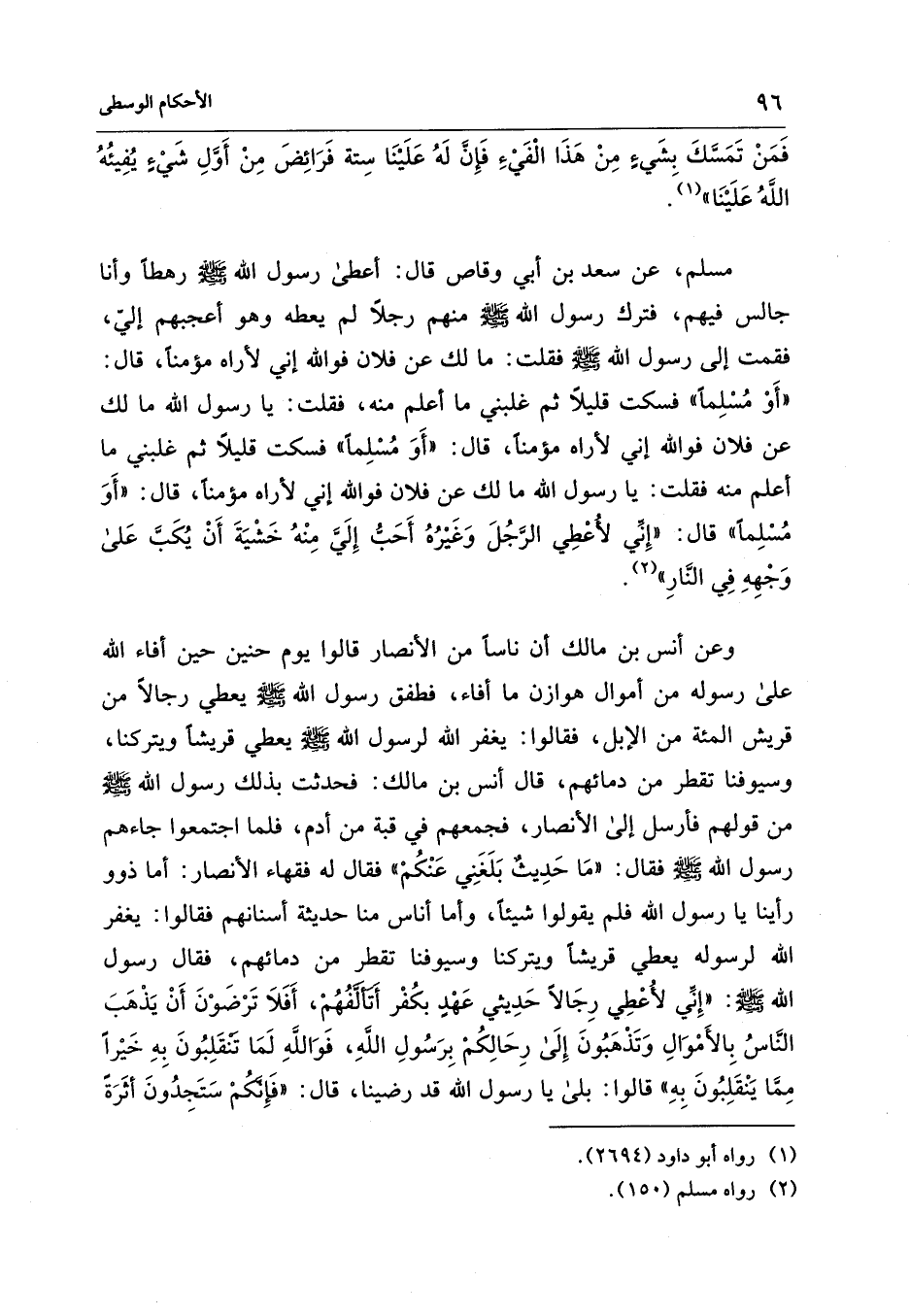 مسلم، عن سعد بن أبي وقاص قال: أعطى رسول الله - صلى الله عليه وسلم - رهطًا وأنا جالس فيهم، فترك رسول الله - صلى الله عليه وسلم - منهم رجلًا لم يعطه وهو أعجبهم إليّ، فقمت إلى رسول الله - صلى الله عليه وسلم - فقلت: ما لك عن فلان فوالله إني لأراه مؤمنًا، قال: