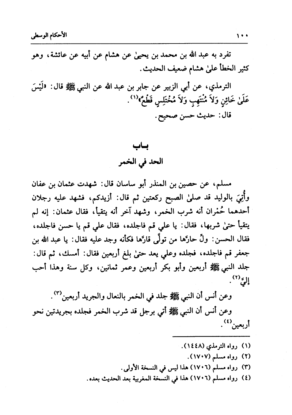 مسلم، عن حصين بن المنذر أبو ساسان قال: شهدت عثمان بن عفان وأُتِيَ بالوليد قد صلى الصبح ركعتين ثم قال: أزيدكم، فشهد عليه رجلان أحدهما حُمْران أنه شرب الخمر، وشهد آخر أنه يتقيأ، فقال عثمان: إنه لم يتقيأ حتى شربها، فقال: يا علي قم فاجلده، فقال علي قم يا حسن فاجلده، فقال الحسن: ولِّ حارَّها من تولَّى قارَّها فكأنه وجد عليه فقال: يا عبد الله بن جعفر قم فاجلده، فجلده وعلي يعد حتى بلغ أربعين فقال: أمسك، ثم قال: جلد النبي - صلى الله عليه وسلم - أربعين وأبو بكر أربعين وعمر ثمانين، وكل سنة وهذا أحب إليَّ (¬2).