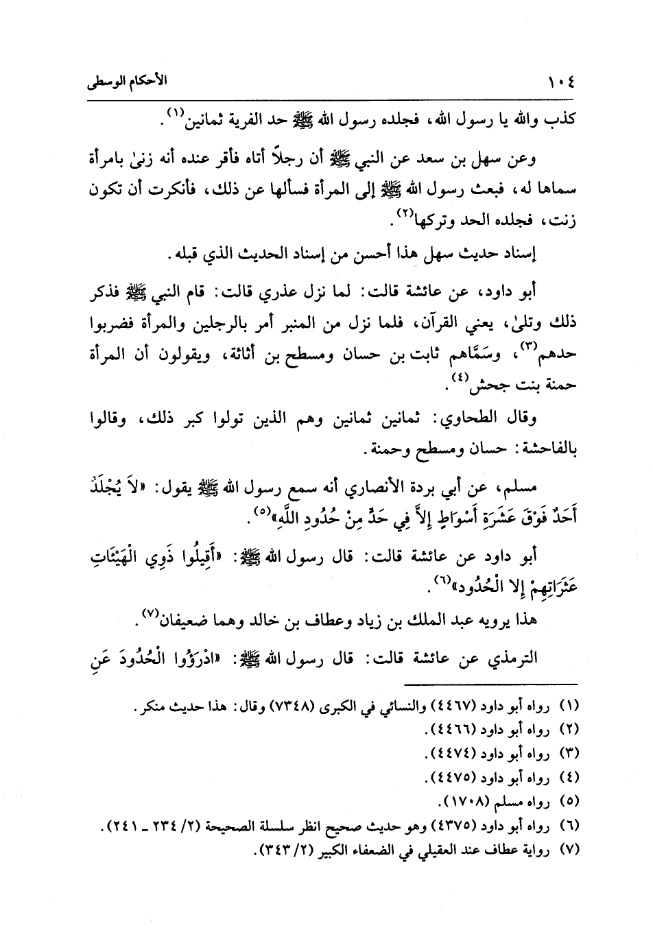 أبو داود، عن عائشة قالت: لما نزل عذري قالت: قام النبي - صلى الله عليه وسلم - فذكر ذلك وتلى، يعني القرآن، فلما نزل من المنبر أمر بالرجلين والمرأة فضربوا حدهم (¬3)، وسَمَّاهم ثابت بن حسان ومسطح بن أثاثة، ويقولون أن المرأة حمنة بنت جحش (¬4).