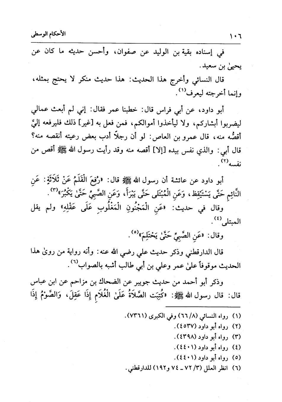 أبو داود عن عائشة أن رسول الله - صلى الله عليه وسلم - قال: "رُفِعَ الْقَلَمُ عَنْ ثَلاَثَةٍ: عَنِ النَّائِمِ حَتَّى يَسْتَيْقِظ، وَعَنِ الْمُبْتَلى حَتَّى يَبْرَأَ، وَعَنِ الصَّبِيِّ حَتَّى يَكْبُرَ" (¬3).