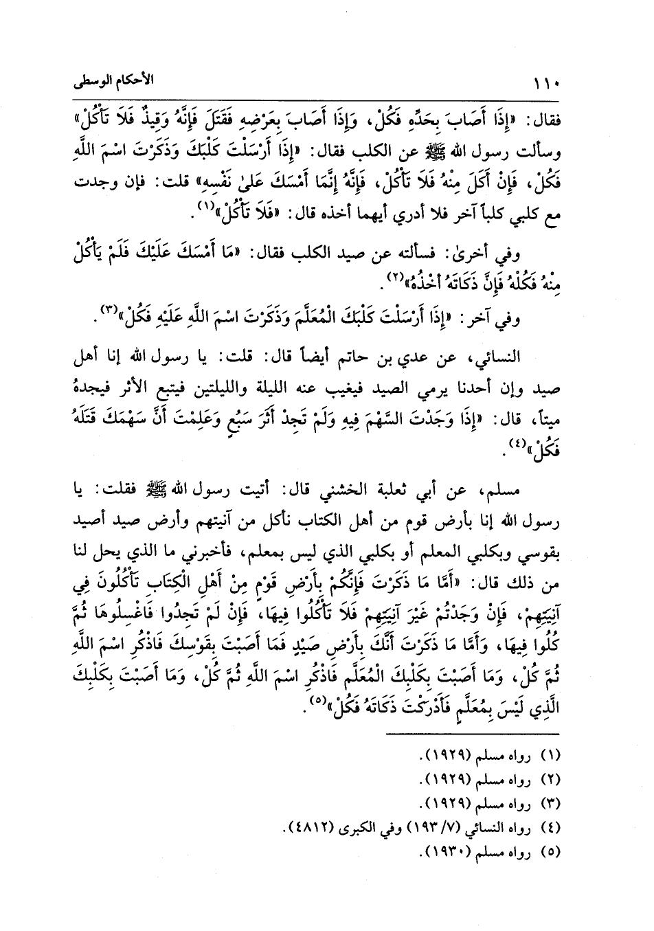 مسلم، عن أبي ثعلبة الخشني قال: أتيت رسول الله - صلى الله عليه وسلم - فقلت: يا رسول الله إنا بأرض قوم من أهل الكتاب نأكل من آنيتهم وأرض صيد أصيد بقوسي وبكلبي المعلم أو بكلبي الذي ليس بمعلم، فأخبرني ما الذي يحل لنا من ذلك قال: "أَمَّا مَا ذَكَرْتَ فَإِنَّكُمْ بأَرْضِ قَوْمٍ مِنْ أَهْلِ الْكِتَابِ تَأْكُلُونَ فِي آنِيَتِهِمْ، فَإِنْ وَجَدْتمْ غَيْرَ آنِيَتِهِمْ فَلاَ تَأكُلُوا فِيهَا، فَإنْ لَمْ تَجِدُوا فَاغْسِلُوهَا ثُمَّ كُلُوا فِيهَا، وَأَمَّا مَا ذَكَرْتَ أَنَّكَ بِأَرْضِ صَيْدٍ فَمَا أَصَبْتَ بِقَوْسِكَ فَاذْكُرِ اسْمَ اللهِ ثُمَّ كُلْ، وَمَا أَصَبْتَ بِكَلْبِكَ الْمُعَلَّم فَاذْكُرِ اسْمَ اللهِ ثُمَّ كُلْ، وَمَا أَصَبْتَ بِكَلْبِكَ الَّذِي لَيْسَ بِمُعَلَّمٍ فَأَدركْتَ ذَكَاتَهُ فَكُلْ" (¬5).