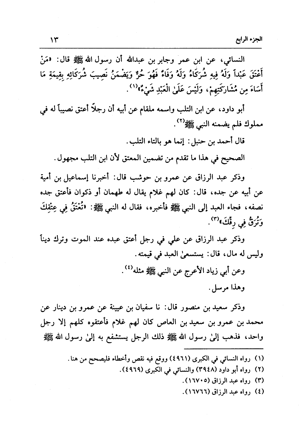 النسائي، عن ابن عمر وجابر بن عبد الله أن رسول الله - صلى الله عليه وسلم - قال: "مَنْ أَعتَقَ عَبْدًا وَلَهُ فِيهِ شُرَكَاءُ وَلَهُ وَفَاءٌ فَهُوَ حُرٌّ وَيَضْمَنُ نَصِيبَ شُرَكَائِهِ بِقِيمَةِ مَا أَسَاءَ مِن مُشَاركَتِهِم، وَلَيْسَ عَلَى الْعَبْدِ شَيْءٌ" (¬1).