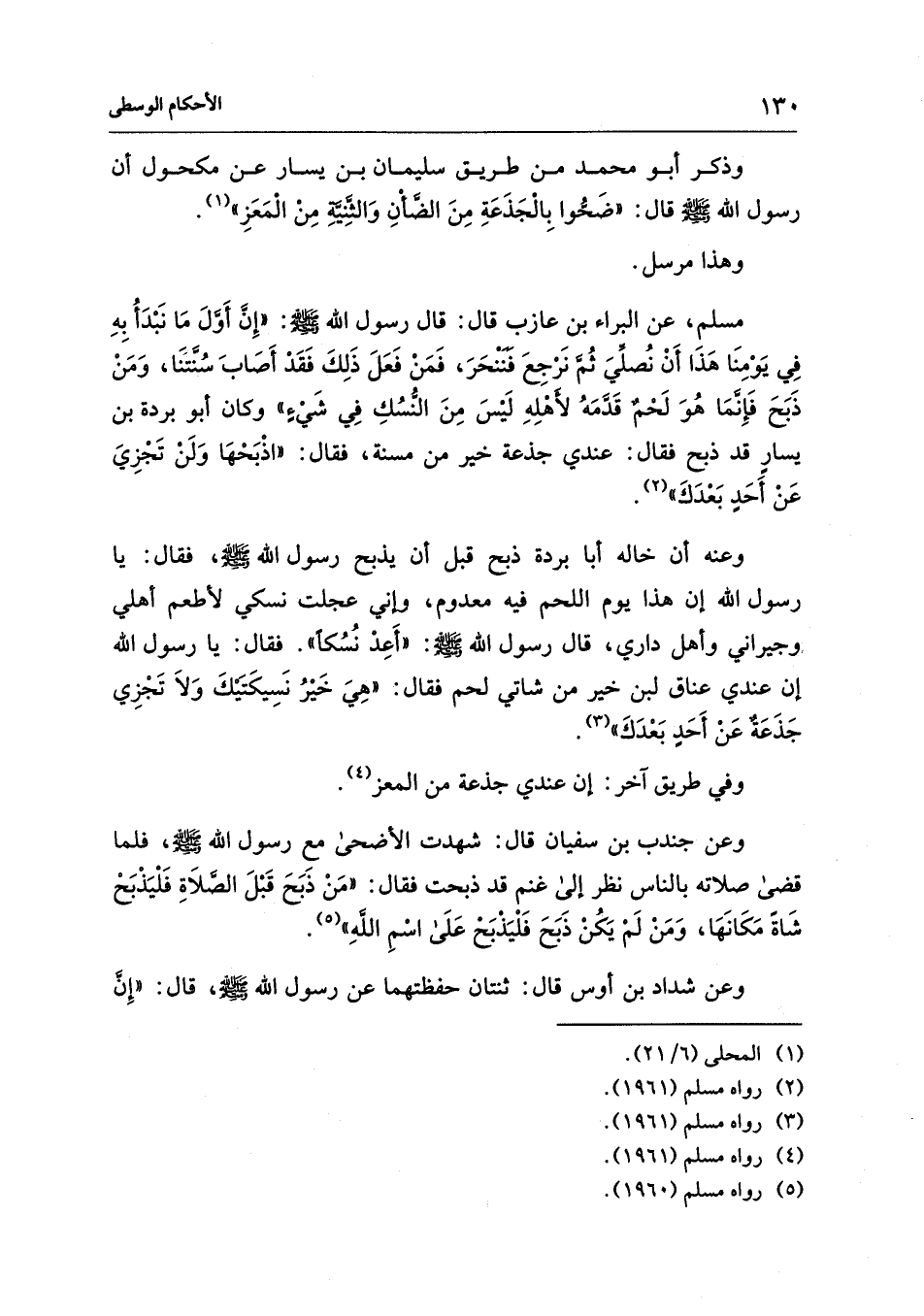 مسلم، عن البراء بنِ عازب قال: قال رسول الله - صلى الله عليه وسلم -: "إِنَّ أَوَّلَ مَا نَبْدَأُ بِهِ فِي يَوْمِنَا هَذَا أَنْ نُصلِّيَ ثُمَّ نَرْجِعَ فَنَنْحَرَ، فَمَنْ فَعَلَ ذَلِكَ فَقَدْ أَصَابَ سُنَّتَنَا، وَمَنْ ذَبَحَ فَإِنَّمَا هُوَ لَحْمٌ قَدَّمَهُ لأَهْلِهِ لَيسَ مِنَ النُّسُكِ فِي شَيْءٍ" وكان أبو بردة بن يسارٍ قد ذبح فقال: عندي جذعة خير من مسنة، فقال: "اذْبَحْهَا وَلَنْ تَجْزِيَ عَنْ أَحَدٍ بَعْدَكَ" (¬2).