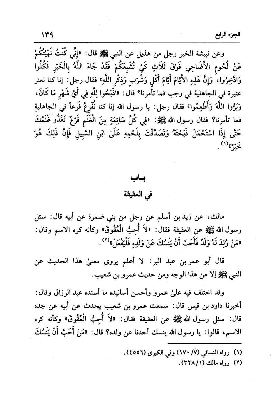 مالك، عن زيد بن أسلم عن رجل من بني ضمرة عن أبيه قال: سئل رسول الله - صلى الله عليه وسلم - عن العقيقة فقال: "لاَ أُحِبُّ الْعُقُوقَ" وكأنه كره الاسم وقال: "مَنْ وُلدَ لَهُ وَلَا فَأَحِبُّ أَنْ يَنْسُكَ عَنْ وَلَدهِ فَلْيَفْعَلْ" (¬2).