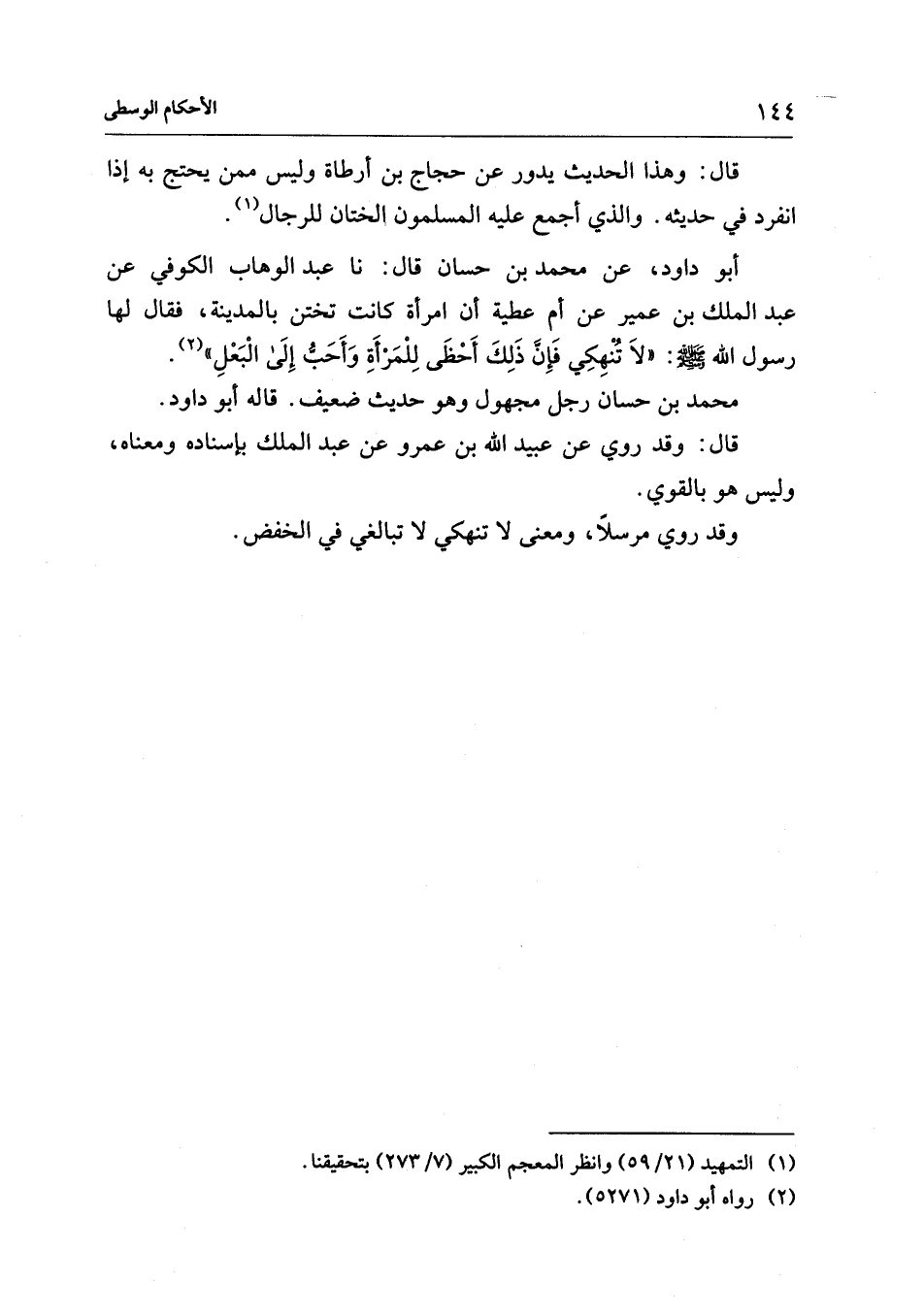 أبو داود، عن محمد بن حسان قال: نا عبد الوهاب الكوفي عن عبد الملك بن عمير عن أم عطية أن امرأة كانت تختن بالمدينة، فقال لها