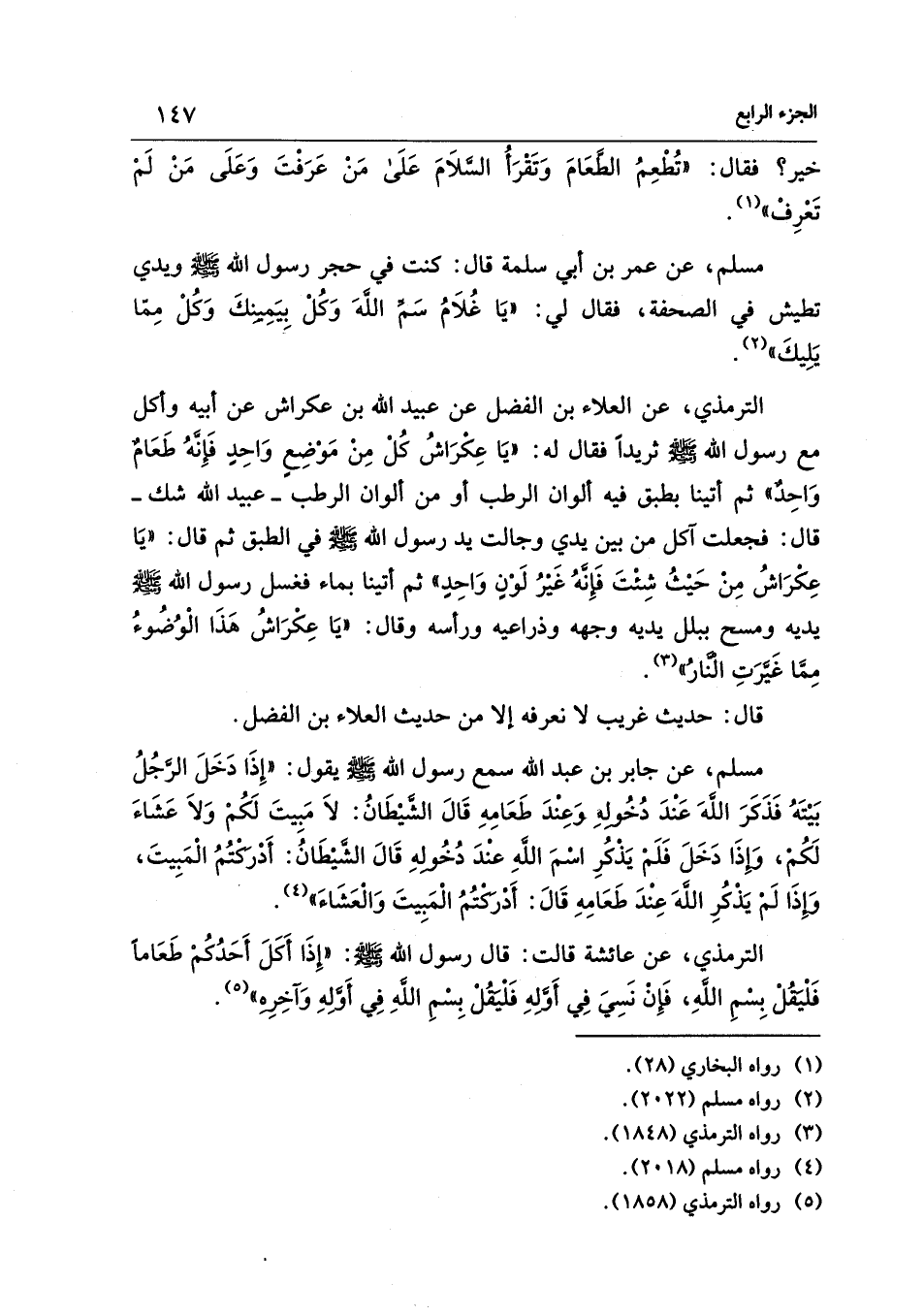 مسلم، عن عمر بن أبي سلمة قال: كنت في حجر رسول الله - صلى الله عليه وسلم - ويدي تطيش في الصحفة، فقال لي: "يَا غُلاَمُ سَمِّ اللهَ وَكُلْ بِيَمِيِنكَ وَكُلْ مِمّا يَلِيكَ" (¬2).