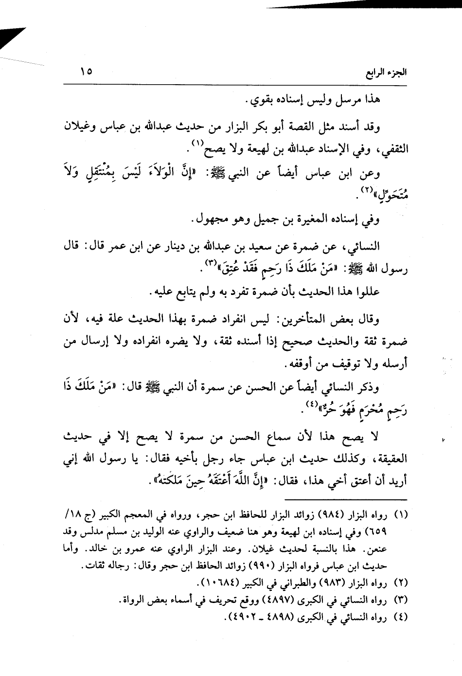 النسائي، عن ضمرة عن سعيد بن عبد الله بن دينار عن ابن عمر قال: قال رسول الله - صلى الله عليه وسلم -: "مَنْ مَلَكَ ذَا رَحِمٍ فَقَدْ عُتِقَ" (¬3).