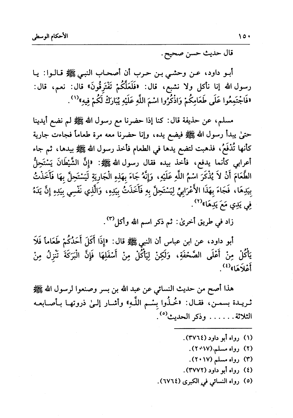 أبو داود، عن ابن عباس أن النبي - صلى الله عليه وسلم - قال: "إِذَا أَكَلَ أَحَدُكُمْ طَعَامًا فَلاَ يَأْكُلْ مِنْ أَعْلَى الصَّحْفَةِ، وَلَكِنْ لِيَأْكُلْ مِنْ أَسْفَلِهَا فَإِنَّ الْبَرَكَةَ تَنْزِلُ مِنْ أَعْلاَهَا" (¬4).