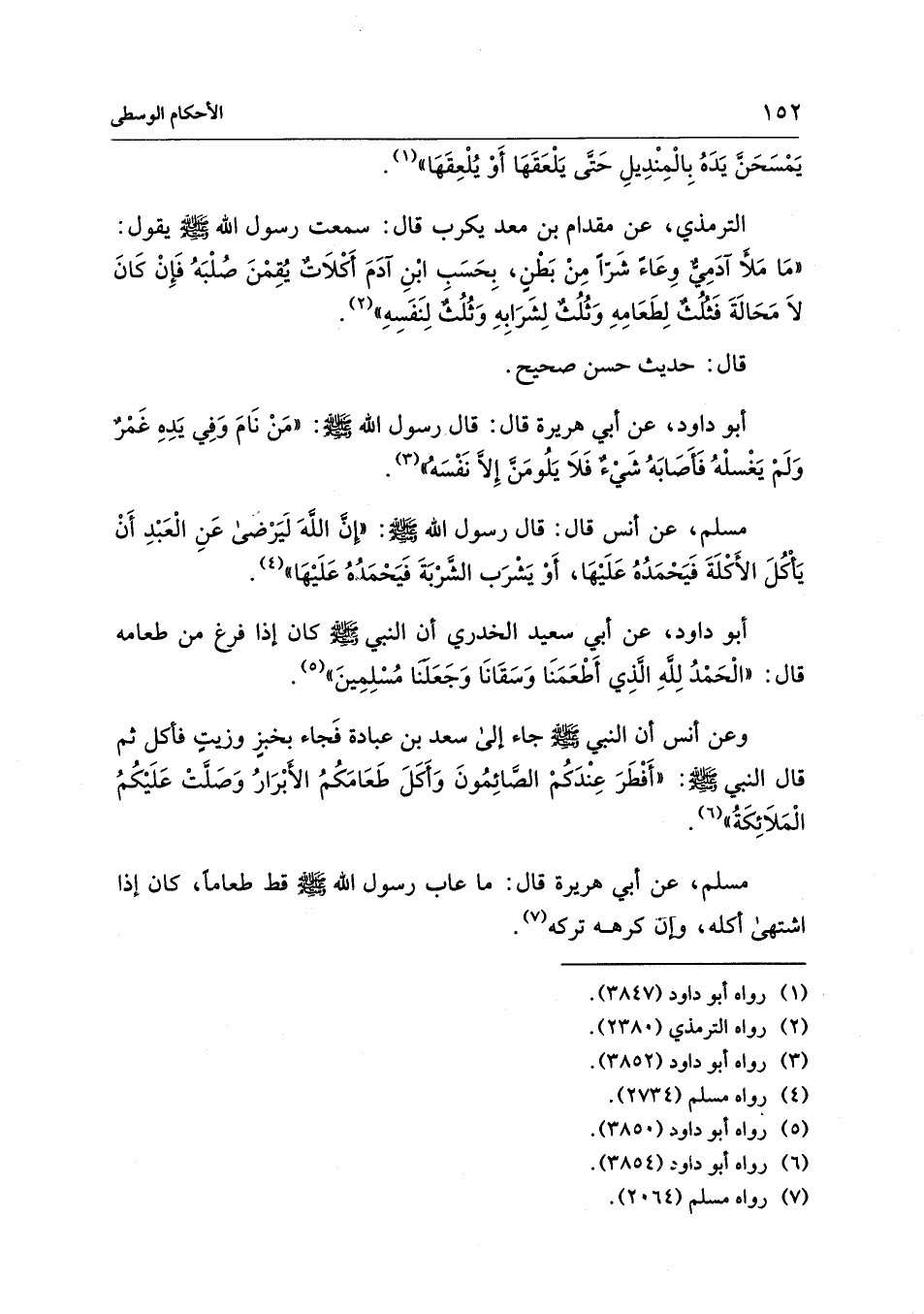 الترمذي، عن مقدام بن معد يكرب قال: سمعت رسول الله - صلى الله عليه وسلم - يقول: "مَا مَلأ آدَمِيٌّ وِعَاءً شَرًّا مِن بَطْنٍ، بِحَسَب ابْنِ آدَمَ أَكْلاَتٌ يُقِمْنَ صُلْبَهُ فَإِنْ كَانَ لاَ مَحَالَةَ فَثُلُثٌ لِطَعَامِهِ وَثُلُثٌ لِشَرَابِهِ وَثُلُثٌ لِنَفَسِهِ" (¬2).