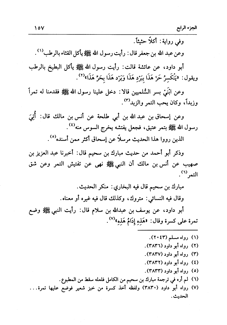 أبو داود، عن عائشة قالت: رأيت رسول الله - صلى الله عليه وسلم - يأكل البطيخ بالرطب ويقول: "يَنْكَسِرُ حَرّ هَذَا بِبَرْدِ هَذَا وَبَرْد هَذَا بِحَرِّ هَذَا" (¬2).