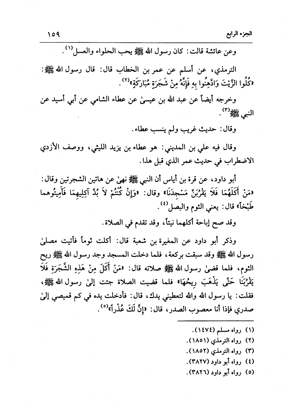 وذكر أبو داود عن المغيرة بن شعبة قال: أكلت ثومًا فأتيت مصلى رسول الله - صلى الله عليه وسلم - وقد سبقت بركعة، فلما دخلت المسجد وجد رسول الله - صلى الله عليه وسلم - ريح الثوم، فلما قضى رسول الله - صلى الله عليه وسلم - صلاته قال: "مَنْ أَكَلَ مِنْ هَذِهِ الشَّجَرَةِ فَلاَ يَقْرُبَنا حَتَّى يَذْهَبَ رِيحُهَا" فلما قضيت الصلاة جئت إلى رسول الله - صلى الله عليه وسلم -، فقلت: يا رسول الله والله لتعطيني يدك، قال: فأدخلت يده في كم قميصي إلى صدري فإذا أنا معصوب الصدر، قال: "إِنَّ لَكَ عُذْرًا" (¬5).